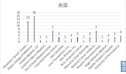 可以看到University of Pennsylvania(Abramson Cancer Center of the University of Pennsylvania 13项,University of Pennsylvania 4项)17项最多,其次是Baylor College of Medicine。公司方面是诺华、Juno、Kite三家。