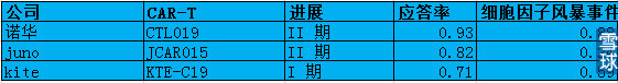 CAR-T领域三个大玩家的临床效果怎么样呢?如下是进展比较快的几个项目的数据: