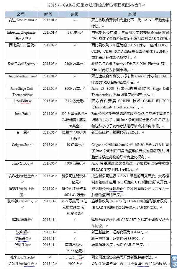 最成功的CD19-CART,其治疗慢性淋巴性白血病的效果就低于急性淋巴性,实体肿瘤的效果差得就更远。客观分析实体肿瘤疗效不好的原因,问题出在实体肿瘤在慢性发展过程中,在体内构成一个刀*不入的微环境。这里面有浸润性的调节性T细胞(Treg细胞)、肿瘤相关巨噬细胞、PD-L高表达、抑制性细胞因子(比如白介素10、TGFb),这一系列因素把肿瘤保护得非常严密。静脉回输CAR-T细胞后,没几个T细胞能归巢到肿瘤位置。宾大的5例实体肿瘤临床数据报道后,还拖累了Juon和Kite的股价。 可能的解决办法是第四代的CAR。第四代CAR让T在工作时,会共表达一个白介素12因子。在CAR上,让白介素12在靶向位置局部表达,可以改善免疫治疗微环境。把附近的NK细胞召唤过来并激活,下调Treg细胞的数目,并把浸润的T细胞功能唤醒。 5.投资标的: 这两年在肿瘤免疫方面的交易合作特别多,2015年的部分如下: