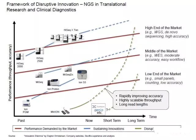 哈佛商学院教授 Clayton Christensen 提出颠覆性创新是一种与主流市场发展趋势背道而驰的创新活动,其颠覆威力极为强大,一般成果的企业都难以适应这类创新带来的挑战。 而纳米孔测序具有潜在的颠覆性创新特征(图3)。