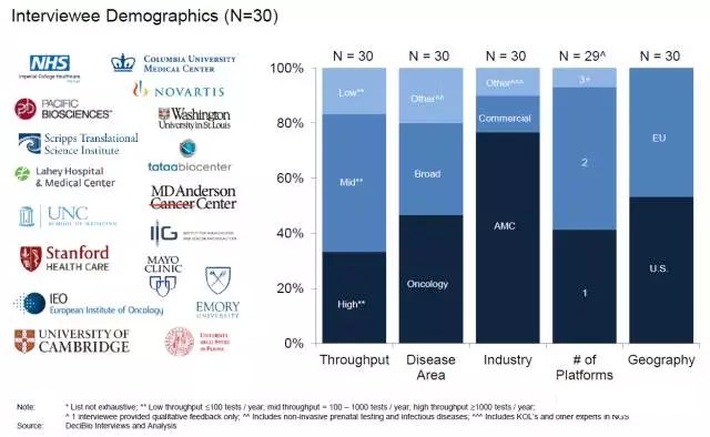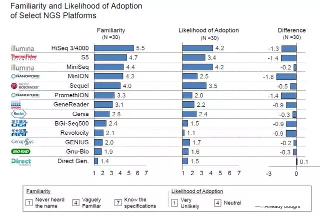 (图1)30位专家受访者情况 测序仪 对于测序仪产业而言,短期内,Illumina公司在NGS临床应用市场中仍处于主导地位;长期来看,NGS临床市场竞争日趋激烈,处于动态发展之中。纳米孔测序仪的精确性正在快速提高,并将带来颠覆性创新。鉴于其可扩展性,预测纳米孔测序仪的性能将很快能满足临床应用的需要,并有可能突破现有的技术(如边合成边测序技术)。部分受访专家表示对多种新型测序平台感兴趣(图2)。