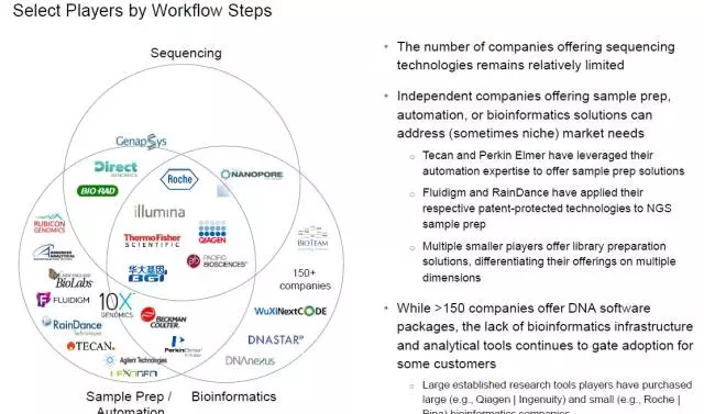 行业分工 NGS快速增长的市场吸引了众多公司的参与。但提供测序技术的公司数量依然相对有限。提供样品制备、自动化或生物信息学解决方案的独立公司符合了市场的需求。尽管有多于150家公司提供DNA分析软件包,生物信息学的基础设施和分析工具仍不健全。 见图7。