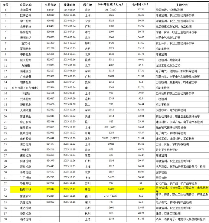 近期有13家检测机构筹备或即将(部分已获批)登陆新三板挂牌。包括明峰检测、恩迪生物、中迅德检测、赛孚股份、华安检测、建科集团、储融检测、逸德汽车测试、宝藤生物、环湾检测、安博检测、绿洁科技、奥达清环境检测等。 1. 明峰检测 宁波明峰检验检测研究院股份有限公司已于近日正式申请新三板挂牌,其挂牌材料于2月29日在全国股转系统披露。明峰检测成立于1997年5月,于2015年10月完成股改。 研究资料显示,明峰检测2015年1-8月、2014年度、2013年度营业收入分别为1413.59万元;3267.44万元、1329.68万元;净利润分别为104.15万元、490.00万元、2.99万元。 公告显示,明峰检测2013年末、2014年末和2015年8月末的应收账款余额分别为451.97万元、1105.39万元和1391.62万元,占当期期末资产总额的比例分别为 41.90%、39.63%和55.81%。 明峰检测主要针对石化装置、压力容器、压力管道等特种设备提供无损检测服务,同时根据具体项目的需要也提供相关理化检测服务。 2. 恩迪生物 12月2日,全国中小企业股份转让系统公告显示,恩迪生物的挂牌申请获得批准公开转让,证券代码为:834655。 公告显示,恩迪生物2013年度、2014年度、2015年1-6月营业收入分别为387.17万元、524.26万元、418.35万元;净利润分别为-4.65万元、-17.65万元、-202.33万元。 恩迪生物(恩迪生物科技河北股份有限公司)成立于2011年2月25日,主营业务为各类医疗器械及耗材代理和销售业务和基因检测业务,公司未来发展的主要方向是基因检测业务。 3. 中迅德检测 12月23日消息,厦门中迅德检测技术股份有限公司已于近日正式申请新三板挂牌上市,其挂牌材料于12月21日在全国股转系统披露。中迅德成立于2010年4月30日,于2015年11月26日完成股改,董事长许松茂、董事兼总经理蔡志杰、董事黄进步、董事唐昕野四人为公司实际控制人。 公告显示,中迅德2013年、2014年、2015年1-8月营业收入分别为1161.51万元、1231.16万元、982.71万元;净利润分别为217.31万元、151.89万元、632.83万元。 中迅德主营业务收入主要来自于福建省内检测业务以及淘宝平台,公司目前尚未计划大规模拓展省外业务以及其他平台业务,业务区域相对集中的风险不容忽视。如果未来福建地区的企业或机构减少对检测业务的投入,或者福建地区或淘宝平台的检测业务竞争加剧,而公司又无法采取有效应对措施的情况下,将会对公司的经营业绩产生不利影响。 中迅德主营业务为纺织品、鞋类、皮革箱包、装饰装修材料、环境检测等领域的检测服务和技术支持服务。 4.赛孚股份 1月6日消息,全国中小企业股份转让系统公告显示,赛孚股份的挂牌申请获得批准公开转让,证券代码为:835338。 公告显示,赛孚股份2013年度、2014年度、2015年1-7月营业收入分别为分别为3218.65万元、2968.41万元、1541.11万元;净利润分别为166.05万元、89.51万元、46.55万元。 赛孚股份(上海赛孚燃料检测股份有限公司)成立于1996年1月9日,主营业务为燃料检测。 赛孚股份业务涉及煤炭、焦炭、铁矿石及石油产品的质量检验、城市生活垃圾的检测分析,并提供天然矿产品领域及船舶燃油承退租的重量鉴定工作。 5. 华安检测 1月4日,安信证券股份有限公司与华安检测科技股份有限公司新三板上市辅导签约仪式暨首轮投融资见面会在大良新城区华桂园国际会议厅举行。此举意味着安信证券与华安检测未来将携手运用资本市场的力量促进华安检测的规范运行与发展,为广东省职业病防治工作贡献力量。 据国家卫生计生委发布《2014年全国职业病报告》,我国2014年共报告职业病29972例;而据华安检测总经理李焕晖介绍,近几年,中国每年因工伤事故和职业病给国家带来的经济损失更达到2000亿元以上。在此背景下,近年来,国家对劳动者职业健康的保护力度不断加大,职业卫生检测成为了民生工程的重要一环。 “以广东为例,现有企业约116万家,每家企业每年购买检验检测服务的费用约为1万元,即使实际业务发生费用打8折,每年服务产值亦达到92.8亿元,行业巨大的市场需求由此可见一斑。”有业内人士告诉记者,中国已成为继欧美后第三大的检验检测市场,全国检验检测市场服务产值已逾1600亿元。 6. 建科集团 1月21日消息,江苏镇江建筑科学研究院集团股份有限公司(证券简称:建科集团 证券代码:835457)获批通过协议转让的方式在全国股转系统挂牌公开转让。 建科集团2015年1-6月、2014年度、2013年度营业收入分别为7089.56万元、1.36亿元、1.34亿元;净利润分别为844.82万元、1241.52万元、2675.84万元。 建科集团成立于2006年12月,主营业务为建设工程质量检测、建筑设计、建筑工程项目管理、工程监理、咨询、建筑科技研究和开发、新型建材生产销售及工程加固设计施工。 7. 储融检测 1月29日消息,上海储融检测技术股份有限公司已于近日正式申请新三板挂牌,在全国股转系统披露的挂牌资料显示,储融检测成立于2011年9月5日,于2015年11月26日完成股改,董事长陈洪道、董事李红梅合计持股66%,为公司共同控股股东、实际控制人。 公告显示,储融检测2013年度、2014年度、2015年1-8月营业收入分别为2110.72万元、3077.23万元、2225.15万元;净利润分别为370.00万元、690.61万元、624.89万元。 储融检测主要为众多电池制造商提供电池产品第三方认证检测服务,主要服务于电池UL认证检测、电池CB认证检测、电池 BIS认证检测、电池CTIA认证