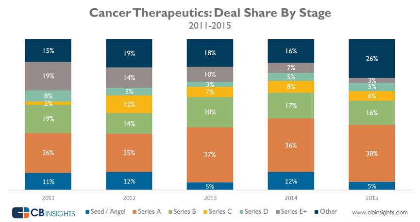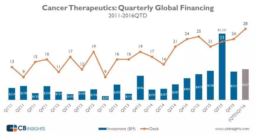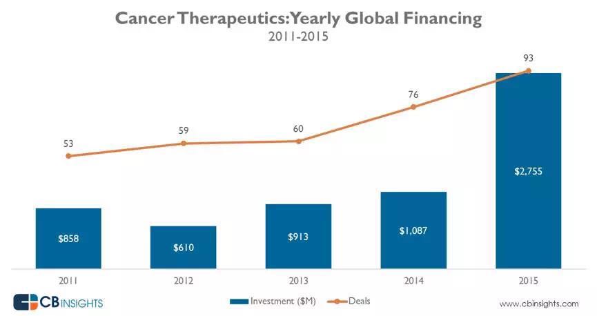 ![]() 癌症治疗初创企业的融资一年内增长153%。本季度已经刷新历史记录。 近来特别引人关注的是,抗癌药物已成为制药企业关注的高利润领域。自2013年以来,有五分之一的初创公司投资交易是关于抗癌药物和治疗,这些初创企业包括ADC Therapeutics(肿瘤药物开发公司)、即将首次公开募股的Corvus Pharmaceuticals(生物制药公司)和Unum Therapeutics(细胞免疫治疗公司)。 鉴于此,我们用数据库来分析全球范围内生物技术和药物研发初创企业的融资情况。这些公司专注于癌症治疗,包括肿瘤免疫(一种以免疫系统为目标去抵抗癌症的疗法)、溶瘤病毒(能杀死癌细胞的病毒)、抗体的运用以及一些针对肿瘤干细胞(被认为会导至肿瘤)的药物。 2011年以来,这些公司总共融资数额超过67亿美元,交易量在2011到2015年之间翻了一番。我们的分析涵盖所有的股权融资以及可转换票据的融资。 本篇报告包括以下信息 全球融资历程 各阶段投资 最活跃的投资者 获得融资最多的公司 全球年度交易量和融资额 2015年,癌症治疗初创公司的融资猛涨153%,从2014年的11亿美元增长到28亿美元。 相比去年22%的增长,2015年还有5轮1亿美元以上的大规模融资,其中最大的一次是Immunocore(位于英国的一家肿瘤免疫疗法的公司)的A轮融资,数额高达3.2亿美元。 2011年以来,无论是交易量还是融资额均平稳增长,仅在2012年融资出现下滑。 与之前两年相比(交易增长分别为11%和2%),2013年以后的交易量大幅增长(14年和15年交易量均增长22%或以上)。 ![]() 全球季度交易量和融资额 总部位于旧金山的初创公司Gritstone Oncology获得1.02亿美元的A轮投资,在其影响下,2015年第三季度的融资额创下5年季度之最。该季度的平均交易金额为5200万美元。 本季度,即16年第一季度的交易量已经刷新五年之最。本季度超过25家公司完成融资,总融资额超过5.5亿美元。这其中包括位于美国加州帕罗奥多的Forty Seven的 A轮投资,数额达7500万美元(投资方包括谷歌风投和Lightspeed Venture Partners),以及NextCure的A轮融资,数额达6700万美元(投资方包括OrbiMedAdvisors、Pfizer Venture Investments和Sofinnova Ventures)。Forty Seven和NextCure都是肿瘤免疫疗法的初创公司。 ![]() 各阶段交易份额 五年来,最主要的投资阶段针对早期的初创公司,其中2015年癌症治疗公司种子期和A轮的份额达到43% 而真对成熟阶段企业的投资额占比下降了17个百分点,从2011年的26%下降到2015的9%。 “其他”的类别中包括阶段未公开的融资,企业少数股权的交易,以及可转换票据。 ![]() 最活跃的风险投资者 名单上,OrbiMed Advisors投资了超过15家不同的公司,包括NextCure、ORIC Pharmaceuticals、Syndax、Pharmaceuticals、Aduro BioTech以及Corvus Pharmaceuticals。风险投资者参与了20轮以上的融资,对这些公司的投资总额超过8亿美元。 活跃度排行第二的公司----位于麻省的MPM Capital,近日在其网站宣布:它将与财富管理公司UBS合作,创立“只关注肿瘤治疗且投资对象同时包括私人股权和公共股权”的肿瘤基金。它最近一次参与的是Tizona Therapeutics的B轮融资,金额达4300万美元。 ![]() 最活跃的早期风险投资者 总体上最活跃的风险投资者OrbiMed在交易次数上也排名首位,参与了 Corvus Pharmaceuticals、 Loxo Oncology以及 CleaveBiosciences发起的A轮融资。 “最活跃的投资者”名单上排名第六的Atlas Venture在“最活跃的早期投资者”中名列第二,其领投的公司包括X4 Pharmaceuticals、Surface Oncology、Unum Therapeutics、Raze Therapeutics、F-star Alpha以及CoStim Pharmaceuticals。 ![]() 获得投资最多的公司 Stemcentrx是名单上资金最充裕的公司,去年成功加入独角兽俱乐部。支持该公司的投资者包括Founders Fund、Artis Ventures以及Sequoia Capital。Stemcentrx目前专注于瞄准并消灭癌症干细胞。 抗体治疗公司Symphogen(资金最充裕的公司名单上排行第二)在2015年发起了一轮可转换票据的融资,数额达7.5亿美元。 所有的排名是基于以往进行的股权融资(包括可转换票据)。名单上其中一家公司Corvus Pharmaceuticals计划于本月下旬首次公开募股。 ![]() |