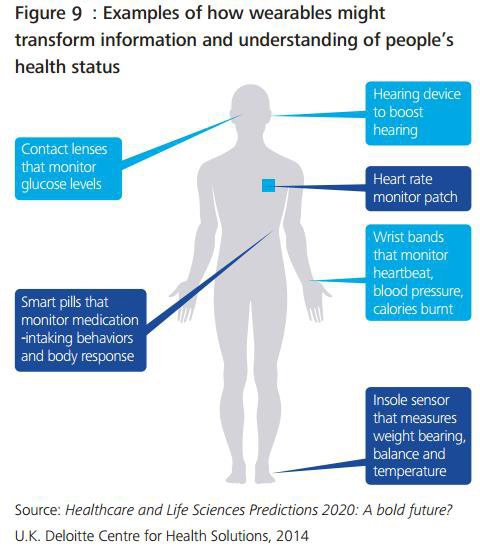 医疗技术创新 医药创新 人类基因组和精准医药的出现,开辟了靶向治疗最具挑战性疾病的新途径。然而,医疗创新的成本代价也很高。眼下,医疗创新会继续拉高医疗成本。 比如,美国批准的治疗丙肝新药,虽然长远来看,新药物将节省肝功能衰竭、癌症的治疗成本,但药品单价仍然昂贵。为此,部分州以及商保公司实际是限制新药的使用范围,最终导至公私营机构的激烈竞争,政府也会对比新旧药的应用成本、综合考虑。 精准医疗 个性化的精准医疗将从过去质量泛化的大规模医疗,变为整合药物和设备的综合诊断、疾病管理。比如,美国政府的FY2016预算就提出2.15亿美元用于精准医疗,重点是建设大型纵向延伸研究,并在法律框架下,保证患者数据在众多医疗机构和组织间共享。 基于遗传学的个人健康护理将从根本上改善预后效果,比如30%~40%的患者服用药物是有副作用的,然而精准治疗将帮医生制定更准确的治疗方案,减少副作用。 数字化地连接医疗 未来趋势是打通院内院外,实现医患间随时随地交流。医疗机构将探索医患增进交流的模式,鼓励患者参与,支持院外的预防、管理慢病。由移动医疗mHealth概念逐渐转化为连接医疗cHealth。通信、诊断、治疗和监控的过程数字化实现离不开医疗技术的进步。 可穿戴设备能捕捉数据,移动医疗APP和社交媒体都参与其中。例如,发展中国家严重缺乏医疗资源和基础设施,尤其是农村地区,所以需要探索数字化技术改善基础医疗服务,以弥补和城市健全医疗体系的差距。 全球数字医疗市场包括无线医疗技术、电子健康档案EHR、电子病历EMR、移动医疗、远程医疗和其他。2013年全球市场608亿美元,2020年 预计为2333亿美元,年复合增长率为21.2%。而且,数字医疗发展带动了无线设备、传感器与智能设备的发展。2014年数字医疗的投资超过40亿美 元,远程医疗是增长最快的领域,从2013年到2014年,一年间增长了3.15倍。 举例可穿戴设备如何搜集人体健康数据,隐形眼镜监测血糖、听力设备增强听力、心率监测设备、腕带监测心跳和血压及热量、智能药片监测服药的生理反应、鞋垫传感器测量体重、体脂平衡和温度。如图9所示: