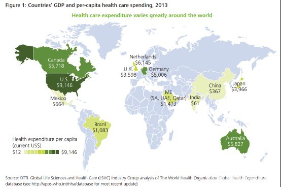 全球医疗健康领域,包括医疗服务商、支付方、政府和其他利益方,正积极以高效、公平合理的手段改善医疗服务。慢病扩散以及人口老龄化是引发变化的主要原因。 经济学人信息部(EIU)的报告指出,按美元计算,2014年60个国家的医疗健康支出平均增长了2.6%,同时世界卫生组织WHO的一份报告指出,发达国家和发展中国家之间的医疗行业支出差异明显。图1能看到中国2013年人均医疗花费为367美元,离美国人均9146美元差距显著。
