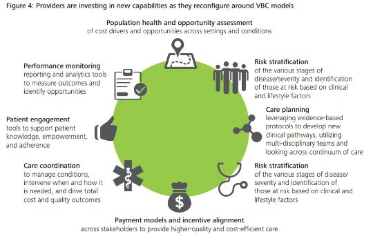 追求人口健康 负责健康管理的医疗机构意识到现在更需要提前预知人们的疾病风险,医疗机构和社会保健体系当通力合作,让公共和私营部门共同由疾病治疗转型为医疗预防,从而优化医疗结果。尽管在英国、墨西哥、日本和德国已经显现了好的苗头,但整体来看,预防医疗还处于早期阶段。 价格评级标准的改变 最著名的转变就是美国提倡医疗改革从由按服务项目付费的FFS模式,转向按服务结果付费的VBS方式。现状是一些机构在积极为VBC模式作准备,另一些仍 然保持观望态度。行动缓慢的医疗机构其行为是可以理解的,因为VBS模式的投资巨大,且FFS付款模式利润可观,而且利益相关方对医疗价值判断还未作出明 确合理的硬性规定。所以,当医疗费用和病人数量同步激增,利益相关方需要想方设法采取更低廉的成本来应对。现实是很多障碍正阻挡目标的实现。 VBC模式 医疗卫生系统正在通过优化供应链,加速资金周转,改善服务。比如批量采购、提高记录管理、减少劳动力成本支出、提高临床医疗效率,这些途径都能在短期内提 升利润,但终究不是最本质的解决办法。前瞻性地卫生医疗系统对现有财务业务模型更为看重,会重视每一美元换来的医疗实际价值。 图3反映了VBC付费模式由FFS、共享节约、绑定付费、风险共担到成本平摊等模式的过渡,由低阶向高阶,医疗机构承担的控费责任和支付费用风险也越来越高。 为此,医疗机构为重建VBC模式,需要围绕如下方面进行投入: 1.对医疗表现进行评估:采取报告和分析工具测量结果; 2.病人参与:利用工具提升病人医疗知识和能力,增加治疗依从性; 3.医疗协同:医疗服务方审时度势地适时参与管理,减少成本,提升质量; 4.风险分担:对由临床或病人生活习惯引发的疾病风险进行分级管控; 5.医疗计划:基于循证医学开发新的医疗路径,持续管理疾病。