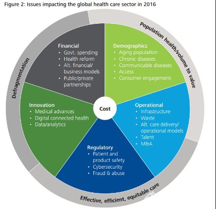 全球2016年预计医疗花费增长四个百分点,2017年和2018年将平均超过6%,尤其是亚洲和中东地区,私立或公立医疗花费都将继续上涨。但现 实是矛盾的,既要控费,又要提高服务水平,为此EIU预测2015~2019年,全球医疗健康支出平均仅增加4.3%,占据总GPD的比例是由2015年 的10.3% 下降到2019年的10.1%。 纵观影响2016全球医疗行业的几大因素,分别是人口、经济、运营、创新和制度监管。如图2所示。尽管医疗费用增加与行政费用、保险费上涨、护理成 本过高等密切相关,但另一方面,采用新医疗技术和创新手段也会导至医疗成本上涨。但未来发展道路是明晰的,相关部门必须寻求新的方式以降低成本。
