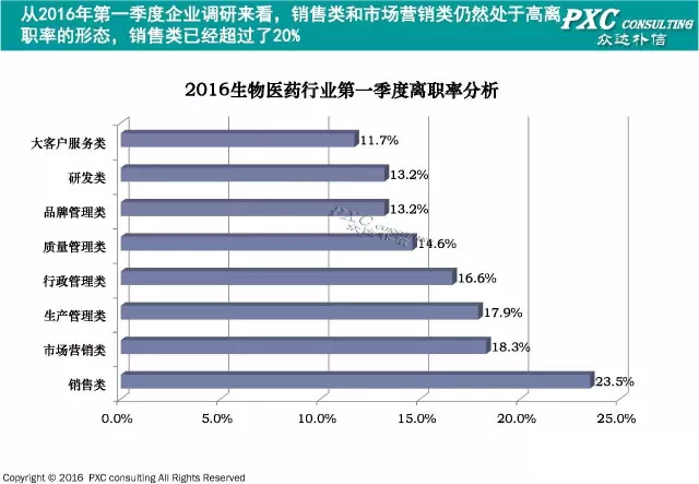 从2016年笔者薪酬调研来看,生物医药行业销售类已经超过20%的离职率,研发和大客户服务类比较稳定。