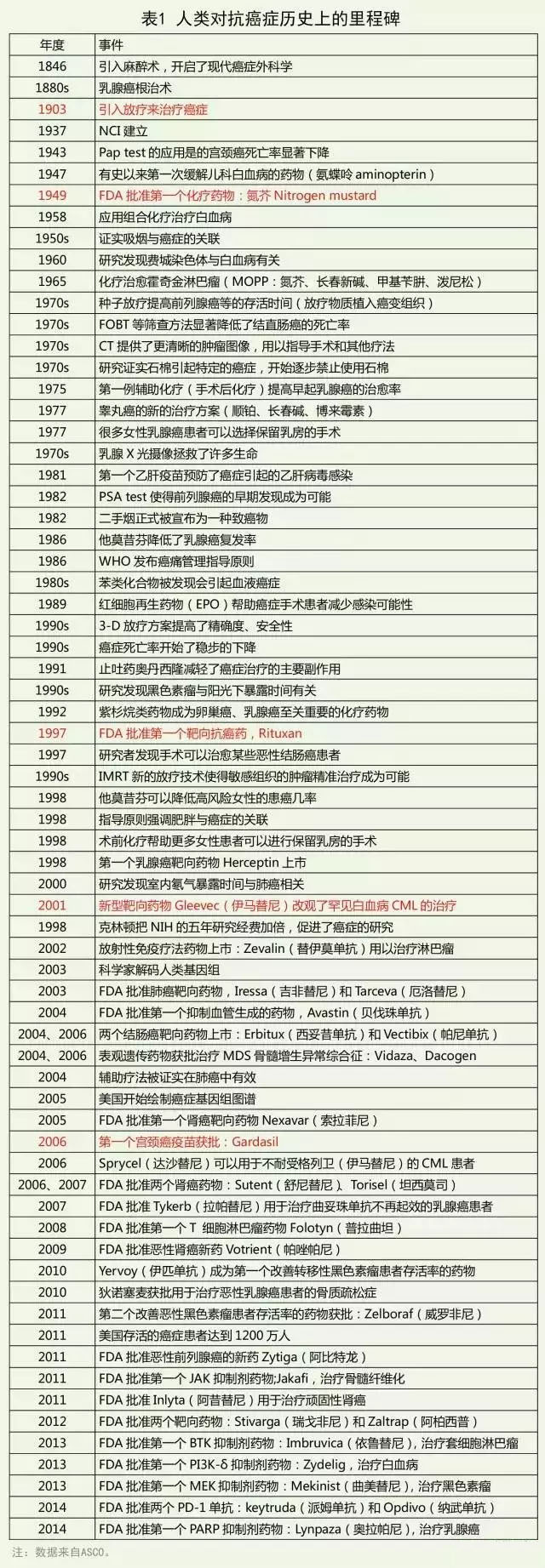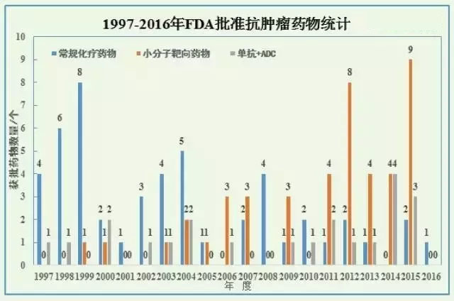 本文统计了1953年至今FDA批准的210个抗肿瘤药物(包括止吐药等对抗化疗副作用的药物),数据可能不完全,欢迎业内朋友指正和补充。 1997年FDA批准的第一个靶向肿瘤药物:Rituxan(利妥昔单抗),开启了肿瘤治疗的新时代。1997年至今,FDA共批准了146个抗肿瘤药物:包括128个抗肿瘤药、8个止吐药、3个止痛药、1个调节血小板药物、1个防止感染药物、1个BiTE免疫疗法药物。 人类对抗癌症历史上的里程碑 近20年间,肿瘤治疗发生了根本性的改变:虽然1971年尼克松总统向癌症宣战的诺言没能实现,但癌症基本上逐步成为一种可控制的疾病。70年代末的乳房X光筛查拯救了许多人的生命,1991年止吐药的应用很大程度上缓解了化疗的主要副作用,1997年第一个靶向抗癌药Rituxan上市,更有效更加安全的疗法开始用来对付癌症。直到今天,已经有2/3的癌症患者成为5年存活者。下表将一起梳理人类对抗癌症历史上的里程碑事件。