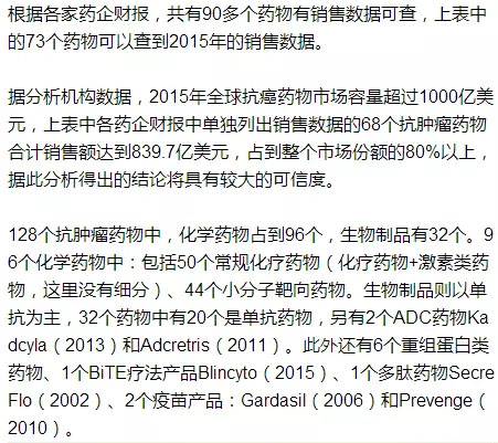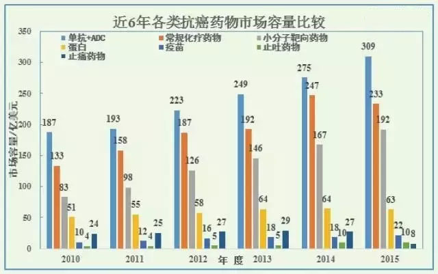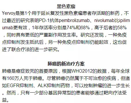 国内市场 国内的抗癌药物市场仍以常规化疗药物为主,靶向药物方面,2005年上市的益赛普、泰欣生是国内最早的抗体药物,益赛普2015年销售额10亿元,泰欣生销售额4-5亿元。小分子靶向药物,贝达药业2011年上市的凯美纳(埃克替尼),在2014年实现7个亿的销售收入,作者暂未获取2015年最新的销售数据。2014年上市的康柏西普,2015年实现3个亿销售收入,深圳微芯的HDAC抑制剂西达本胺,上市时间不长,暂未获得销售数据。恒瑞的阿帕替尼据说销售表现一般,具体情况尚不清楚。 国内市场不作为本文重点,暂时写到这里,欢迎业内朋友互相交流、分享数据。 抗癌药物进展 根据ASCO发布的《Clinical cancer advances 2016》,癌症免疫疗法仍然是2016年的关键看点。