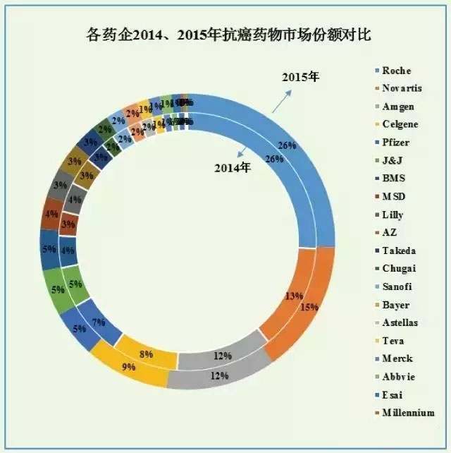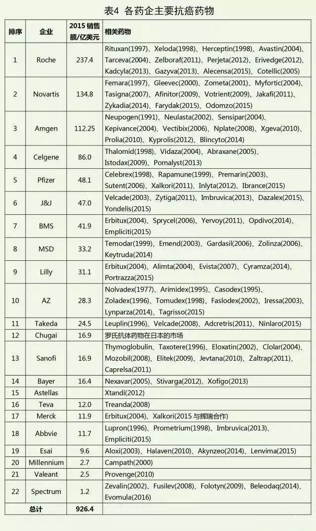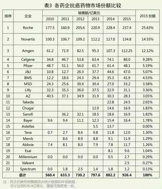 抗癌药物领域企业市场格局统计 各药企抗癌药物市场份额比较,表3: