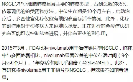 更重要的是,研究发现,免疫点抑制剂药物的治疗效果是更加持久的。而PD-1抗体pembrolizumab在用于治疗复方性NSCLC时达到了12个月的中位存活时间,同时1/5的患者肿瘤大小发生萎缩,PD-L1高表达的患者甚至可以缩小一半的体积。2015年2月,FDA授予PD-L1抗体atezolizumab一项突破性疗法认定。 免疫点抑制剂的适应症拓展 除了黑色素瘤和肺癌之外,近期的研究发现免疫点抑制剂在许多不同癌症类型中都有很好的疗效。振奋人心的发现是,对于许多传统疗法抵抗的癌症,免疫点抑制剂仍然有效。例如: 膀胱癌:过去30年里,复发性膀胱癌的治疗都没有什么进展,膀胱癌患者的平均诊断年龄是73岁,且伴随严重的肾损害,很多患者无法承受化疗的严重副作用。最近的研究发现,PD-L1抗体atelizumab在治疗的几周内就能明显的使肿瘤体积萎缩,且治疗的应答起效时间也远远优于常规化疗。2014年,FDA已经授予ztelizumab治疗PD-L1高表达、复发性膀胱癌的突破性疗法认定。 肾癌:肾癌是另一种急需更好疗法的癌症类型,最常见的是肾细胞癌ECC。肾癌的上一次重要进展是在10年以前,VEGF靶点药物和mTOR抑制剂将患者的中位存活时间从1年延长到3年。然而,当两种药物都不再起效的时候,患者仍须进一步延长存活时间的疗法。最近的研究发现,PD-1靶点的药物可能会明显改观这一现象。 一项II期临床试验中,nivolumab用于治疗经VEGF抑制剂药物治疗的RCC患者,结果肿瘤体积缩小20%,中位存活时间从标准疗法的12个月延长到25个月。 肝癌:肝癌是癌症致死原因的第二位,每年有75万人死于肝癌。最常见的肝癌类型和肝细胞癌HCC,FDA批准的复发性HCC的唯一治疗方法是索拉菲尼,只能延长3个月生存期。 2015年,一项针对nivolumab的小规模临床研究中,20%的HCC患者肿瘤体积发生萎缩,2个患者的肿瘤完全消失。应答是持久的,9个月时所有患者都仍然有应答,1年时仍有62%的患者存活。 头颈癌:头颈癌患者的治疗方案极其有限,通常化疗和西妥昔单抗靶向治疗只能存活10-12个月,且只有少数患者有应答,副作用也很大。 早期研究发现,PD-1免疫抑制剂对于头颈癌有效。一项小规模临床研究汇总,pembrolizumab使得25%的头颈癌患者出现肿瘤萎缩。而先前的研究发现西妥昔单抗的应答率低于13%. 霍奇金淋巴瘤:15-40岁、55岁以上人群中霍奇金淋巴瘤发病率最高。在现有的疗法中,诊断后可以有5年生存期。然而,当癌症复发时,几乎无法治疗。正在进行的研究发现,PD-1通路可能在治疗反复性霍奇金淋巴瘤过程中起到重要作用。一项研究中。23名患者中有20名患者对nivolumab应答,17%的患者癌症完全消失。6个月时,只有14%的患者发生了疾病进展。 新型免疫疗法 T细胞疗法给血液癌症带来希望。包括blinatumomab和CAR-T疗法。 Blinatumomab把B细胞上的CD19和T细胞的CD3连接起来,从而把能杀死癌细胞的T细胞与转移性的B细胞淋巴细胞连接起来。 在早期研究中,已经对标准疗法产生抵抗的患者接受blinatumomab治疗后,1/3患者的癌症完全消失。应答是持久的,6个月时,许多患者仍然有应答。 CAR-T疗法采取独特的方式:首先懂病人身上取得T细胞,进行基因编辑和扩增后注射到患者体内,重新编辑的T细胞可以表达能发现和杀死癌细胞的蛋白质。 癌症疫苗 研究人员正在推进癌症疫苗的研究,并不像宫颈癌疫苗那样的预防性疫苗,研究者希望能够研发出治疗性疫苗,可以发现并攻击癌细胞的疫苗。 一项II期临床研究发现,治疗性疫苗可以改善复发性胶质母细胞瘤的治疗。Rindopepimut疫苗通过一种特殊的基因突变EGFRvIII来识别癌细胞,这个突变存在于1/4的胶质母细胞瘤患者中,正常人的脑组织中则不会存在。 |