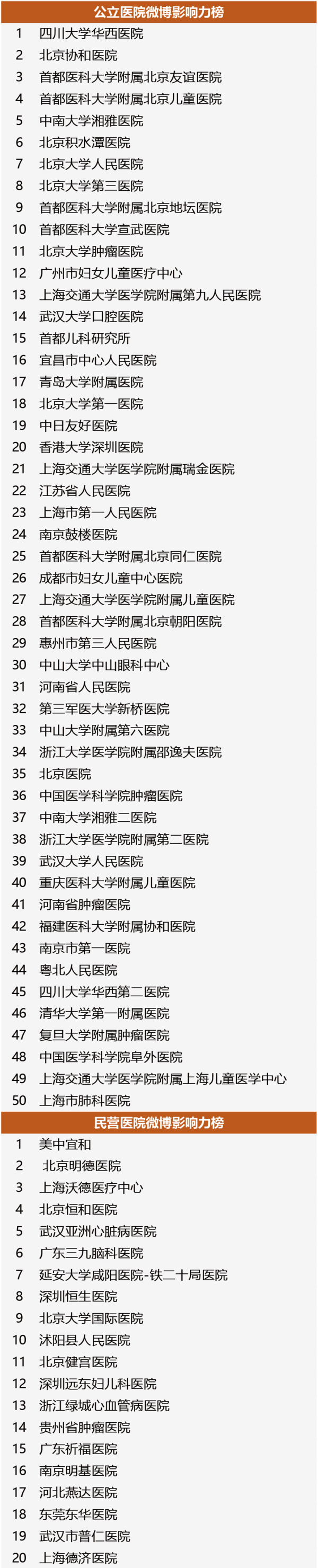 新媒体的强势崛起对医疗行业产生了巨大的影响,短短数年,不论是公立医院还是民营医院,大家都纷纷意识到医院品牌传播的力量。微信微博、舆情监测、健康科普等一个不落,一些医院品牌正在冉冉升起。 2016年4月,丁香园携手新榜共同发布「2015医院品牌传播百强榜」,凭借丁香园16年的行业经验和新榜在新媒体数据及算法的积累,为全行业盘点新媒体时代成功铸造医院品牌的王者之师。本届榜单分为总榜:2015医院品牌传播百强榜及四大子榜:2015年度医院卓越微信榜,2015年度医院微博影响力榜,2015年度医院品牌网络热度榜,2015年度医院品牌传播效度榜。 同期,丁香园将在2016年4月13-16日,于杭州举办「2016中国医疗行业品牌传播高峰论坛」,本次峰会看点之一就是医院品牌传播百强榜的颁奖典礼,如果您想了解更多关于榜单背后的故事,敬请关注我们的高峰论坛,点击了解会议详情。 在品牌传播综合实力的较量上,四川大学华西医院、北京协和医院及北京大学第三医院斩获公立医院品牌传播的前三甲。而再看民营及外资医院,美中宜和、深圳远东妇儿医院、武汉亚洲心脏病医院分列冠亚季军。