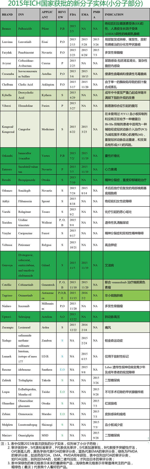 2015年共有49个新分子实体(NME)获得ICH国家批准,49个NME中有11个是全新靶点,PCSK9抑制剂Evolocumab和Alirocumab用于他汀类无效的高胆固醇血症;IL-5单抗Mepolizumab用于哮喘;IL-17A单抗Secukinumab用于银屑病和银屑病关节炎和强直性脊柱炎;SLAMF7单抗Elotuzumab用于多发性骨髓瘤;细胞周期蛋白依赖性激酶(CDK)4/6抑制剂Palbociclib用于乳腺癌。按治疗领域来算,2015年共有14个抗肿瘤药获批,是最多的一年,按分子大小区分,2015年共有34个小分子化药获批,本文就小分子化药方面发表以下鄙见。 1. 抗肿瘤药 1.1 Palbociclib(商品名:Ibrance) 近五年来,免疫、血液病和抗肿瘤药呈现爆发的趋势,主要是得益于单抗行业的迅猛发展,2015年获批的重磅级抗肿瘤药中多为生物制品,抛开生物制品,2015年获批的小分子重磅级产品当属辉瑞的Palbociclib,临床试验证实了IBRANCE联合来曲唑治疗ER+/HER2-局部晚期或转移性乳腺癌患者较单药来曲唑延长了患者的无进展生存期(PFS)。接受Ibrance联合来曲唑治疗实质性的改善了患者的PFS,联合组患者中位PFS为20.2月,接受来曲唑单药治疗患者PFS为10.2月。Palbociclib主要的副作用为中性粒细胞减少、感染和肺部栓塞。市场方面,Palbociclib的表现不容置疑,上市不到一年,销售额就已经超过7亿美元,根据汤森路透分析师预计,Palbociclib在2019年的全球销售额可超过45亿美元。目前该药在国内已申报了进口和仿制,而且已批临床。 1.2 Omisertinib(商品名:Tagrriso) Tagrisso为第三代EGFR抑制剂,是首个用于治疗T790M阳性非小细胞肺癌(NSCLC)患者的药物。在两项2期临床试验中,经其它EGFR抑制剂治疗后病情恶化的T790M阳性NSCLC患者,Tagrisso的应答率分别为57%和61%,在另一项中期实验中,Tagrisso的中位无进展生存期为8.6个月。目前,肺癌是发病率最高的癌症之一,潜在的市场巨大,阿斯利康预计Tagrisso在2016年的销售额将达2.6亿美元、2018年达7.58亿美元、2020年至12.28亿美元,销售峰值将超过30亿美元。 1.3 其它抗肿瘤药 Lenvatinib批准用于转移性甲状腺癌,市场不像Ibrance那么大,但Lenvatinib也是一个疗效不错的药物,临床试验中,Lenvatinib组中位无进展生存率是18.3个月,安慰剂患者的3.6个月,治Lenvatinib总体应答率是64.8%远高于安慰剂组的1.5%,于2015年7月29日获FDA突破性疗法认定, Lenvatinib的销售峰值将超过10亿美元。除此之外,值得关注的是除罗氏的Cobimetinib,Cobimetinib用于治疗黑色素瘤,黑色素瘤在中国的发病率很低,而且疗效也不及其同胞兄弟Vemurafenib,在中国的前景不被看好。 2. 心血管药 2.1 LCZ696(商品名:Entresto) 心血管方面,值得重点关注的当诺华的LCZ696,LCZ696是Sacubitril和Valsartan的复方,这个药物在心力衰竭方面有很好的疗效,也是诺华未来的重磅产品之一,汤森路透预测其2019年的全球销售额将达到37亿美元,但这个产品在中国关注度太高,两年前就已经掀起仿制潮。申报方面,仅有诺华申报进口,并无仿制申报。 2.2 Selexipag(商品名:Uptravi) Selexipag是一种抗肺动脉高压药。临床试验中Selexipag与安慰剂相比,能使肺动脉高压(PAH)患者的发病率/死亡率下降39%。肺动脉高压属于是罕见病,我国大约有4~6万人患病。2014年,全球肺动脉高压药物的全球销量约为50亿美元,比乙肝(约20亿美元)药物市场规模还要大一倍。目前全球在售的抗PAH药物主要为磷酸酯酶抑制剂西地那非、他达拉非、利奥西呱、波生坦、安倍生坦和依前列醇。与这些药物相比,Selexipag疗效更胜一筹,汤森路透分析师预计其在2020年的全球销售额将超过12亿美元。 3. 抗肠易激综合征药 Eluxadoline是一种μ-阿片受体激动剂,用于肠易激综合征引起的腹泻(IBS-D),FDA表示,10%~15%的美国人有IBS经历。IBS-D是这种疾病的一个亚型,IBS患者约四分之一的时间会出现松散或水样便。临床试验显示,它在减轻腹痛,改善粪便稠度,相比于安慰剂更有效。IBS是非常值得关注的领域,中国约有1200万患者,而且没有特效药上市。抛开IBS-D,IBS-C(肠易激综合征引起的便秘)也是研究热门,武田的鲁比前列酮是第一个批准用于IBS-C的药物,但疗效很一般,重磅当属2012年批准的Linaclotide,Linaclotide上市两年,销售额已经超过5亿美元,是汤森路透预计的重磅之一,其预计2020年的销售额将超过20亿美元。Linaclotide结构为含14个氨基酸的多肽,但由于结构内有三个二硫键,国内尚无公司在原料药合成上取得的突破,至今尚无申报。除了Linaclotide,处于三期临床的Plecanatide也非常值得期待,Plecanatide比Linaclotide的副作用更小,而且只有两个二硫键。 4. 抗痛风药 骨骼肌肉方面是阿斯利康的Lesinurad,这个药效果很好,但具有心脑血管风险,是一个富有争议的药物。目前我国痛风患者约1350万,但痛风药物的市场仅有几千万,主要原因在于流通我国医院的都是像秋水仙碱、苯溴马隆这样的老药。目前,痛风治疗是国内药品市场增速最快的领域,而且会随着新一代抗痛风药的上市进一步爆发,2009年样本医院用药为2300万,而2014年达5900万,平均增长率高达30%。目前新一代抗痛风药除了Lesinurad,还有富士的托匹司他,武田的非布司他。 5. 抗丙肝药 2014年、2015年是丙肝年,这两年丙肝领域取得了于世瞩目的成就,市场规模从2013年的30亿美金到2014年的140亿美金再到2015年的240亿美金,有火箭发射之势。这得益于吉里德的两个丙肝产品爆发,2015年吉里德全球丙肝销售额超过190亿美元。目前中国尚无丙肝特效药上市,做丙肝药品研发还有很好的机会。毕竟中国有4000万