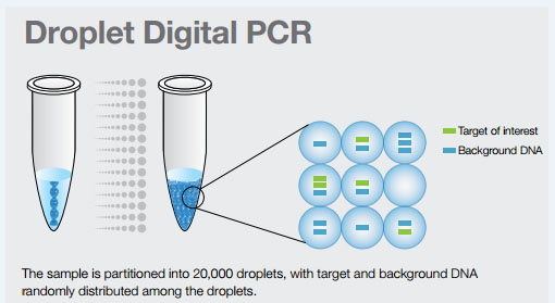 ctDNA的检测: 数字PCR 将一个标准PCR反应分配到大量微小的反应器中,在每个反应器中包含或不包含一个或多个拷贝的目标分子( DNA模板) ,实现“单分子模板PCR扩增”,扩增结束后,通过阳性反应器的数目“数出”目标序列的拷贝数。