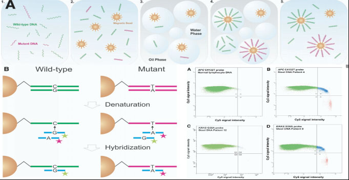 BEAMing技术 结合数字PCR与流式技术,利用特异性PCR引物扩增目标突变区后,与磁珠(磁珠上固定有特异的PCR 引物)混合进行油包水单分子扩增反应。反乳化作用后,利用不同颜色的荧光探针结合磁珠上的PCR产物,发出红色或绿色荧光,再利用流式细胞仪分析磁珠颜色来确定突变情况。