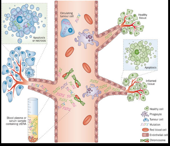 A行显示了磁珠-抗体富集方法;B行显示了物理富集方法;C行显示了最常用的细胞检测方法。 血浆游离肿瘤DNA(‘Cell-Free' Circulating Tumor DNA,ctDNA) ctDNA(circulating tumor DNA)即循环肿瘤DNA是人体血液循环系统中不断流动的携带一定特征(包括突变,缺少,插入,重排,拷贝数异常,甲基化等)来自肿瘤基因的DNA片段。一般来源于坏死或凋亡的肿瘤细胞,循环肿瘤细胞和肿瘤细胞分泌的外排体,但是在了解ctDNA之前,我们要知道另一个与之相关的概念—cfDNA。 cfDNA(cell-free DNA),或者叫血浆游离DNA,是血浆中游离存在的DNA,它们有的来自于正常细胞,有的来自于异常细胞(如肿瘤细胞),还有部分来自于我们外部(如病毒DNA)。