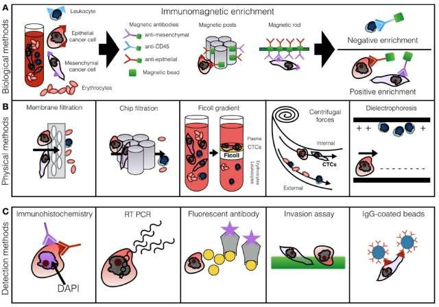 CTCs的检测: 对CTCs检测包含细胞富集和细胞检测两部分,可以进行不同的组合,形成不同的技术。最常见的富集方法是抗体介导或物理方法富集,接下来进行免疫组织化学计数或遗传分析。