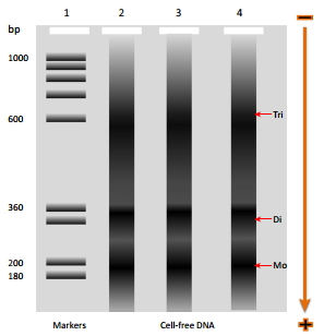 在癌症病人的血浆中发现游离DNA,在孕妇的血浆中发现胎儿DNA,分别在分子诊断中带来了令人兴奋的机会。对于循环游离DNA(cfDNA)生物学特性的理解对于人们在不同的临床环境最佳使用这种分子是必不可少的。在Trendsin Genetics近期在线发表的一篇综述探讨了用于血浆cfDNA谱的分析技术。该篇评论的重点是循环DNA的大小分布。这篇综述将讨论检测cfDNA大小特征的方法;探讨了cfDNA谱在不同临床情况:包括癌症、怀孕等潜在的诊断应用: 妊娠妇女血浆中胎儿来源的分子短于母体分子。 来自肿瘤细胞DNA短于癌症患者血浆中非恶性细胞的。 不同种类的循环DNA大小之间的差异,可用于发展大小为基础的分子诊断,例如最近在无创产前测试和癌症测试的努力。 1决定cfDNA片段大小的方法1)凝胶电泳 cfDNA电泳的条带如图2所示,可以看cfDNA大小谱系显示180bp核小体蛋白的整数(1~5×)倍数,不过电泳在区分和定量上有局限性。