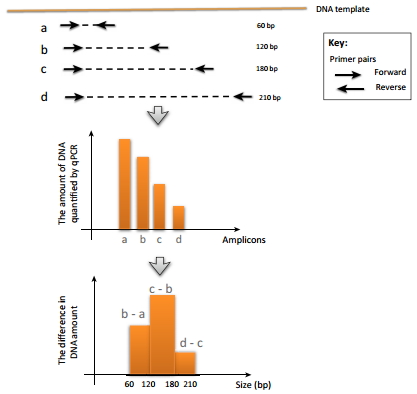 图2 cfDNA凝胶电泳 2)qPCR 运用qPCR来检测cfDNA谱主要是通过运用跨越感兴趣的目标区域的不同大小的扩增片段来实施。如图3所示,不同扩增区定量读长的差异表示了相应不同大小的cfDNA的量,大片段相对于小片段的比例也可以转化成DNA完整性指数。这一原则已经应用在胎儿和母体和片段大小,已经比较肿瘤和肺肿瘤来源的cfDNA。这个方法只能用于已知的位点,而不能用于全基因组范围的分析。