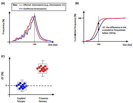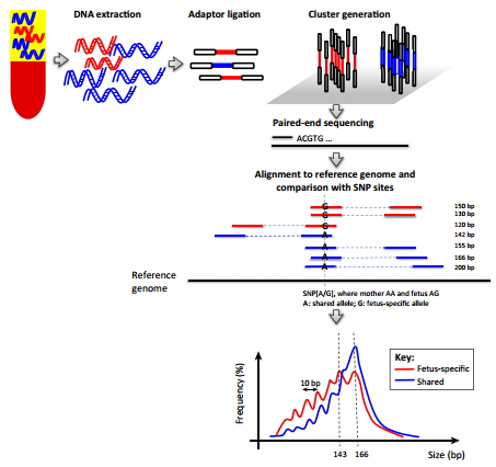 图4 大规模平行测序检测cfDNA分子大小 2cfDNA的来源 如图2这样的大小谱系表明了凋亡是产生cfDNA的重要机制。研究显示了在血浆中的cfDNA在很多状况下产生,比如怀孕、癌症、肝/骨髓移植和系统性红斑狼疮,通常由DNA短片段组成。最近大规模平行测序的结果显示了血浆DNA显示了在166bp有显著的峰,另外有一系列每10bp间隔的143bp等更小的峰。这些发现表明了cfDNA分子是由凋亡的酶分解过程产生的,核小体相关的DNA包装在形成这样的酶切模式中起了重要作用。 1)源于怀孕的DNA分子 早期qPCR的结果显示母亲血浆中源于怀孕的DNA分子要比母亲的背景DNA短。胎儿和母体DNA最显著的差异是166bp的峰相对地减少和143bp等较小的峰相对地增加。通过母体和胎儿DNA之间大小的差异,已被证明血浆DNA大小的分析可用于检测胎儿染色体非整倍数,如图5。研究发现较小尺寸的cfDNA似乎与较低水平的DNA甲基化相关,这种现象可能在塑造cfDNA片段的大小中起了重要的作用。