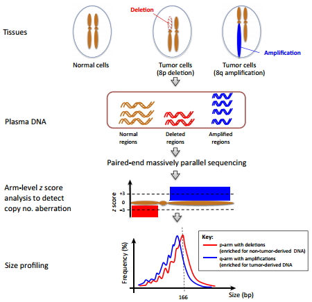 图5 胎儿和母体来源cfDNA的差异 2)肿瘤来源的DNA 运用qPCR分析发现在癌症患者中较长的DNA的比例较多,这种状况被发现在抗癌治疗后是可逆的,如果变化持续的话意味着较差的预后。相反的,用qPCR分析肿瘤相关的突变位点,结果显示从肿瘤细胞来源的cfDNA比从正常组织的要短。 这种从qPCR获得的看似不同的结果出现困惑和难以调和。在2015年,有一项研究试图调和这些明显矛盾的结果(见图6),用配对末端的大规模平行测序对延长和缩短的癌症患者血浆中的DNA进行分析。这比测定胎儿的基因大小分布更具有挑战性,因为肿瘤衍生的血浆DNA不是很容易区分与血浆中非肿瘤来源的背景。尽管癌症特异性突变的检测提供了一种基因型的方法来区分肿瘤与非肿瘤细胞DNA,但只有有限数量的癌症特异性突变存在。大规模平行测序的分析显示在肝癌患者血浆中循环DNA大小谱显示显著的166bp的峰,以及一系列10bp为周期渐减小的峰,和在怀孕妇女和器官移植的受体病人中类似。血浆中肿瘤DNA的量越大,低于150bp的短DNA片段比例越高。