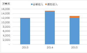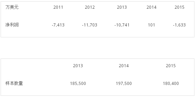 Sequenom是国外基因测序中游企业的代表案例。这家公司的核心业务是无创产前基因检测服务(NIPT),2015年的检测样本数量是18万例,(其最主流的产品是用于唐氏筛查的MaterniT21)。其他几家同领域的公司还包括Verinata Health(Verifi)、Ariosa Diagnostics(Harmony)以及Natara(Panorama)。 从Sequenom的发展情况来看,NIPT的发展有这样三个特点。 首先,在美国用于高危产妇唐筛的无创产前检测已经广泛被商业保险和联邦政府保险认可。Sequenom在披露2015年财报的时候曾表示其75%的检测服务是由保险支付的,不过,随着保险支付覆盖的增加,支付的金额也在快速下降。2015年第四季度,保险支付Sequenom服务的平均价格是每项检测800美金,而2013年的平均支付是1200美金。由此可见,保险将这些服务纳入报销范围虽然带来了量,但作为支付方势必不断靠量的优势来压低价格,受此影响Sequenom的收入也不断下降。 图表1:Sequenom过去三年总营收、亏损情况以及送检样本数量变化