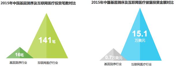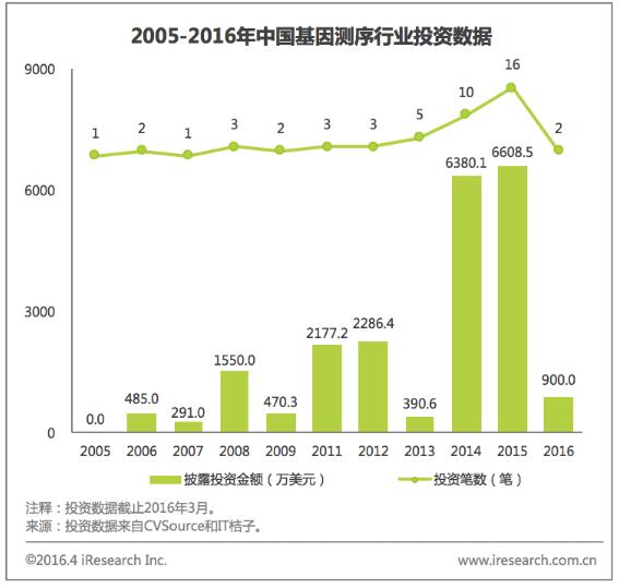 中国基因测序行业远未爆发 艾瑞整理公开数据显示,互联网医疗行业在2015年共获得141笔投资,披露的投资金额为15.1万美元,而2015年中国基因测序行业仅获得16笔投资,披露的投资金额仅0.7万美元,其投资笔数约为互联网医疗行业的十分之一,披露投资金额约为互联网医疗行业的二十分之一。 无论从投资笔数还是披露投资金额来看,现阶段基因测序行业都远未及互联网医疗行业火热。艾瑞分析认为,现阶段中国基因测序行业未普遍受到资本市场热捧的主要原因有:1)基因测序成本仍较其他替代检测高,以产前检查为例,无创产前基因监测的成本在2000-3000元,而羊水穿刺成本则在700元左右;2)应用场景还不够丰富,目前基因测序技术的应用方向主要是科研和临床医疗两个方向,科研面向B端,临床医疗面向C端。C端的应用主要集中在生殖健康和肿瘤诊断和治疗上,C端应用方向仍有非常大的空间。