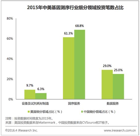 基因测序服务均受中美两国资本青睐,但投资量上差距大 艾瑞整理公开资料显示,2015年中国基因测序行业上游设备及试剂耗材制造环节仅获得1笔投资,披露投资金额为158.1万美元,同美国相比,投资笔数差2笔,披露金额差4061.9万美元;中游测序服务环节共获得11笔投资,披露投资金额为6371.4万美元,投资笔数较美国差8笔,披露投资金额较美国差5812.6万美元;中游数据服务环节获得4笔投资,披露投资金额为79.1万美元,投资笔数较美国少5笔,披露金额较美国少14484.9万美元。从投资笔数占比数据来看,测序服务环节所获投资最多。可见,基因测序服务在中美两国均受到资本市场的青睐,但在披露投资金额上还有非常大的差距。