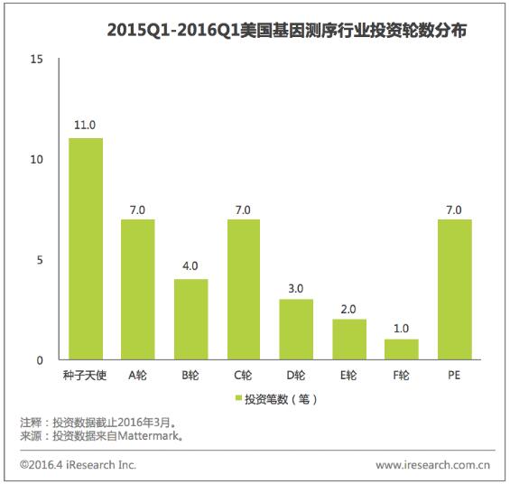 美国基因测序行业累计42笔投资,且以种子天使轮为主 艾瑞整理公开数据显示,2015Q1至2016年3月,美国基因测序行业累计获得42笔投融资,累计披露的投资金额为11.5亿美元,其中2015年基因测序行业获得31笔投资,披露投资金额8.3亿美元。从投资轮数来看,绝大部分投资为种子天使轮和A轮投资,这两类投资总计18笔,占比为42.9%。 艾瑞分析认为,现阶段美国初创企业多集中在复杂疾病的基因测序及治疗上,投资轮数也多以种子天使轮和A轮为主,未来美国基因测序行业仍将受资本市场的青睐,投资数据也将持续增长。同时由于基因测序技术在美国产业化较早,因而C轮以后及PE投融资事件也有相当占比。