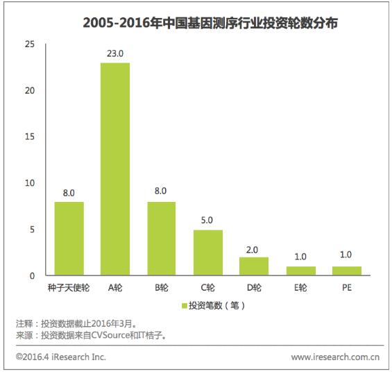来源:投资数据来自CVSource和IT桔子。 中国基因测序行业累计获得48笔投资,以A轮为主 艾瑞整理公开数据显示,2005年至2016年3月,中国基因测序行业累计获得48笔投融资,累计披露的投资金额为2.2亿美元,其中2015年基因测序行业获得16笔投资,披露投资金额6608.5万美元,为11年中最高值。从投资轮数来看,绝大部分投资为种子天使轮和A轮投资,这两类投资总计31笔,占比为64.6%。 艾瑞分析认为,基因测序行业是一个市场空间巨大,基因测序服务的应用方向在不断拓展,市场空间也将进一步拓宽。