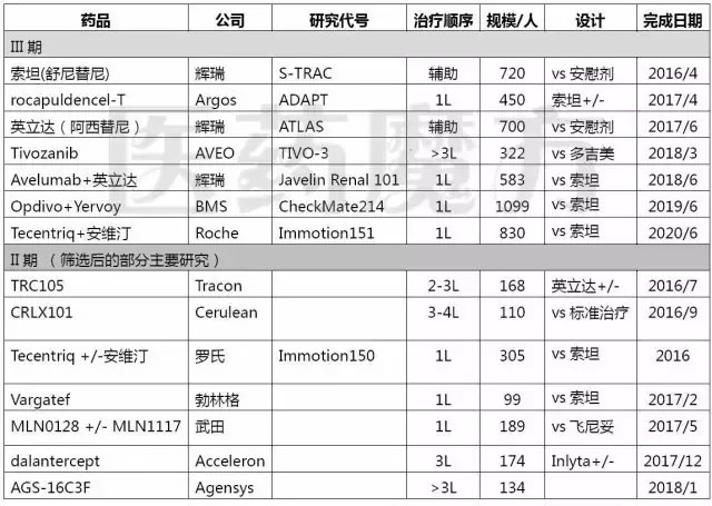 来源:EvaluatePharma;发布时间:2016/3;阿斯利康奥拉帕尼治疗胃癌的GOLD研究已宣布失败。 肾细胞癌