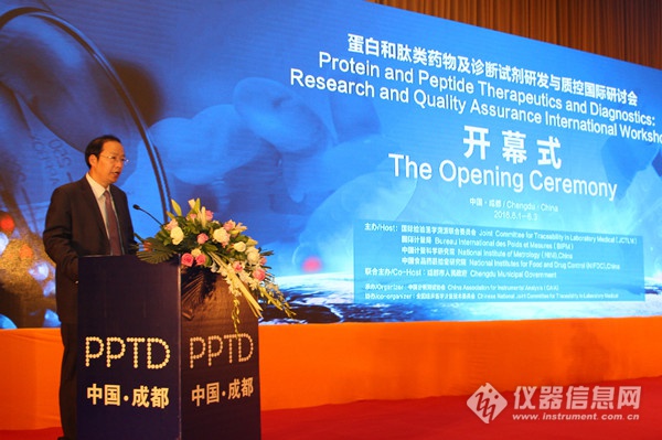 2016年6月1日,在国际检验医学溯源联合委员会(JCTLM)的指导下,由国际计量局(BIPM)、中国计量科学研究院(NIM)和中国食品药品检定研究院(NIFDC)主办、成都市人民政府联合主办,中国分析测试协会(CAIA) 承办、全国临床医学计量技术委员会协办的“蛋白和肽类药物及诊断试剂研发与质控国际研讨会(PPTD)”在四川省成都市香格里拉大酒店胜利召开。国家质量检验检疫总局和国家食品药品监督管理总局给予本次会议极大的支持。 共有来自国际计量局、国际检验医学溯源联合委员会、世界卫生组织、国际临床化学联合会、欧盟标准物质与测量研究院等国际组织,美国、德国、英国、日本、韩国等十一个国家的三十余名国际代表,以及来自中国科学院、中国工程院、数十家大学、研究所及企业的450余名国内代表参加此次研讨会。仪器信息网编辑有幸参与盛会并进行报道。