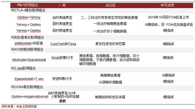 晚期黑色素瘤一线治疗不同的方案临床数据对比 PD-1联用——免疫鸡尾酒疗法引爆行业增长点 PD-1抑制剂是抗癌药的颠覆性产品,其单药有效性已经在黑色素瘤、非小细胞肺癌、肾癌等方面得到试验证实,特别在 PD-L1阳性患者上获得较高的应答率。最好的出路是与其他免疫靶点药物结合使用,多管齐下增强免疫疗法的效果。 PD-1与CTLA-4 联用。百时美施贵宝的药品组合Opdivo+Yervoy,二、三线治疗具有特定突变的黑色素瘤已获批上市,一线治疗晚期黑色素瘤和非小细胞肺癌有望分别于2016年、2019年获批上市。 PD-1与利妥昔单抗联用。CureTech和Teva公司合作研发的新药pidilizumab(PD-1单抗)联合利妥昔对 B细胞淋巴瘤和滤泡细胞淋巴瘤有效。在一项Ⅱ期临床试验中,pidilizumab联合利妥昔单抗治疗复发性滤泡状淋巴瘤也取得疗效。 PD-1与IDO抑制剂联用。Incyte公司的IDO抑制剂Epacadostat和默沙东PD-1单抗 Keytruda联合使用在一个早期临床试验中显示良好的疗效和安全性。PD-1与 T-vec联用。 安进与默沙东于2014年12月签署免疫肿瘤学战略合作,推动癌症疫苗 T-vec与PD-1免疫疗法 Keytruda联合用于晚期黑色素瘤的治疗。2015年6月,双方扩大合作,将该免疫鸡尾酒用于复发性或转移性头颈部鳞状细胞癌的治疗,同时启动该免疫鸡尾酒治疗晚期黑色素瘤的III期临床研究。 PD-1与CCR4单抗联用。2014年12月,百时美施贵宝与日本小野制药、协和发酵麒麟达成临床试验合作协议,计划开展一项 I期临床试验,推进Opdivo和抗CCR4单抗mogamulizumab 组合疗法,用于治疗晚期或转移性实体瘤的安全性、耐受性和抗肿瘤活性。