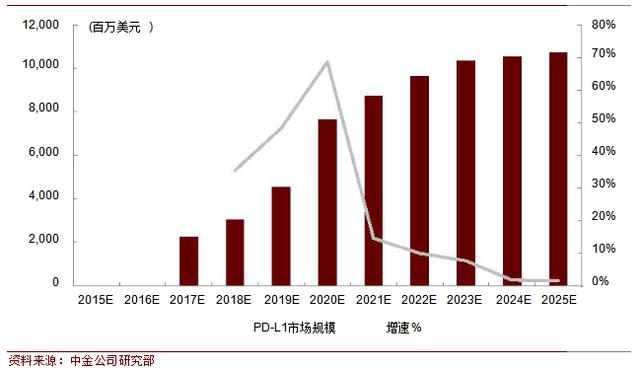 罗氏和阿斯利康 PD-L1单抗研究进展 PD-L1联用——多靶点治疗新选择 PD-L1与贝伐单抗联用。罗氏在14年进行小规模的 MPDL3280A+贝伐单抗临床试验,治疗的肾癌和结直肠癌患者。 PD-L1与CTLA-4联用。阿斯利康重点铺设PD-L1与其他抗肿瘤药物的联用计划,公司CEO Pascal Soriot认为MEDI4736在肿瘤联合治疗中更具优势。目前正在进行联用治疗晚期非小细胞肺癌的III期临床。 PD-L1与T-vec联用。安进和罗氏合作,正在进行T-vec和MPDL3280A治疗发生肝转移的三阴乳腺癌(TNBC)及结直肠癌的I期临床。 PD-L1未来市场 PD-L1单抗规模107亿美元。目前还没有PD-L1产品上市,未来的市场规模将会小于PD-1的市场规模,理由如下: PD-1单抗先人一步已经有产品上市先抢占同类适应症的市场份额; 在临床实验上PD-L1单抗药物所需的剂量大于PD-1单抗一个数量级,今后PD-L1单抗价格会贵于PD-1单抗; 从扩展的适应症方面,PD-L1研究进展慢于PD-1 单抗。因此,预计未来PD-L1的市场规模约为PD-1单抗市场规模的30%,2025年PD-L1的市场规模将达107亿美元。
