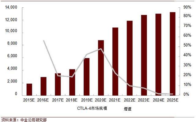 PD-L1单抗市场规模预测 免疫治疗另一靶点——CTLA-4 CTLA-4(细胞毒 T淋巴细胞相关抗原 4)又名 CD152,是 T细胞上的一种跨膜受体。CTLA-4与 B7分子结合后诱导T细胞无反应性,特异地抑制细胞和体液免疫反应。治疗肿瘤的原理为抗CTLA-4单克隆抗体与CTLA-4靶点结合,阻断帮助肿瘤逃避免疫检查的信号通路,刺激机体免疫系统对肿瘤细胞发起攻击。 CTLA-4单抗治疗肿瘤原理图 CTLA-4的未来,联合用药是出路CTLA-4与 PD-1联合用药,潜在133亿市场规模。鉴于CTLA-4的竞争产品PD-1单抗药物的新品频频上市,同时PD-1 单抗的临床研究对应疾病达10 余种。而CTLA-4药物的临床研究仅仅对应黑色素瘤、非小细胞肺癌等几个癌症,所以今后CTLA-4单方药物将受到PD-1单抗的强烈竞争。 最好的出路即为与PD-1药物联用,通过不同的免疫治疗靶点增强疗效。假设CTLA-4的销量为 37%的PD-1销量,则预计到2025年,CTLA-4单抗药物的销售额将达133亿美元。 CTLA-4单抗预计市场规模及其增速