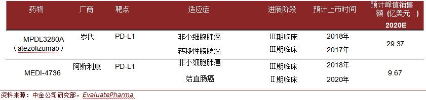PD-1/PD-L1单抗区别 PD-L1单抗在研情况 截至目前,还没有PD-L1单抗药品获批上市。罗氏、阿斯利康等均有在研产品。罗氏的抗PD-L1治疗药物MPDL3280A(atezolizumab)被FDA授予突破性治疗药物资格,用于某些非小细胞肺癌和转移性膀胱癌。 阿斯利康的PD-L1单抗药物MEDI-4736目前正在进行III期肺癌和 II期结直肠癌研究。国内方面,君实生物和百济神州除了在进行 PD-1单抗的研发,也正进行着PD-L1单抗的临床前研究。