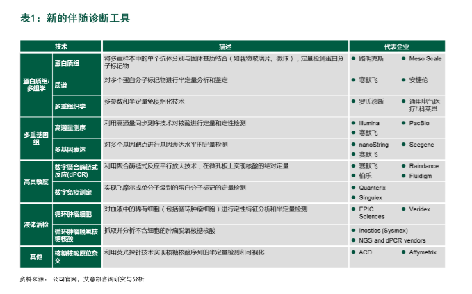 ·肿瘤领域竞争日益激烈 靶向治疗和生物标记物被越来越多地应用于肿瘤治疗中,药企争着招募临床试验病人,分析活检样本,并选择相应的治疗药物。 但是,患者招募的难度也越来越大。药企不断为类似的病人群体开发药物,如赛可瑞(Xalkori)、特罗凯(Tarceva)、阿法替尼(Gilotrif)都用来治疗非小细胞肺癌(NSCLC)。另外,患者样本数量不足也导至某些生物标记物的应用太低,如间变性淋巴瘤激酶(ALK)基因突变在非小细胞肺癌患者中仅占约5%。高度多重测序技术有望能更快速地鉴定患者,让他们尽快参与特定的生物标记物试验。这样的技术对协同性临床试验的作用将更加显着,如根据肺癌主要协议(Lung Master Protocol),美国每年将对近千名晚期肺腺癌患者进行测序,获得肺癌的多种基因突变。 样本获取问题在非小细胞肺癌研究中已经凸显。通过细针穿刺术吸取多重生物标记物进行分析对病理医生来说有一定难度。为解决这一问题,生物制药企业正利用多重测序技术分析同一样本中的多种生物标记物,如高通量测序技术(NGS)。液体活检技术也在研发中,用来分析血液中的循环肿瘤细胞(CTC)或肿瘤DNA(ctDNA)中的生物标记物。 药企还在大范围地寻找改善伴随诊断预测能力的方法,包括多重生物标记物的表达水平(如KRAS基因和NRAS基因),额外基因突变的预测能力(如乳腺癌除了检测BRCA遗传基因突变,也要观察体细胞突变的情况)。 ·监控肿瘤治疗效果或复发 利用个体化治疗方案监控肿瘤复发或治疗应答,肿瘤医生便可以尽早调整或更快推进治疗,从而最优化治疗效果,缩短治疗时间。更好的情况是,循环肿瘤细胞和循环肿瘤DNA液体活检术使得更微创、更低费用的监控成为可能。 ·从细微之处入手探索癌症生物学,找寻新的生物标记物 生物制药企业持续投入重金开发新的生物标记物,并在快速发展的领域中(如肿瘤免疫治疗)探索新的生物标记物。他们正在研究分析细胞或单细胞小型亚群、小倍数变化(如DNA拷贝数变化、基因表达)、多组学生物标记物、更贴近生物机理的标记物(如用RNA替代DNA来检测)以及核酸或蛋白质修饰。这些新兴的生物标记物/基因谱需要仰赖新的检测技术。 很多创新型企业正在开发新的工具来满足这些技术需求,他们有望在将来成为药企的合作伙伴(见表1)。