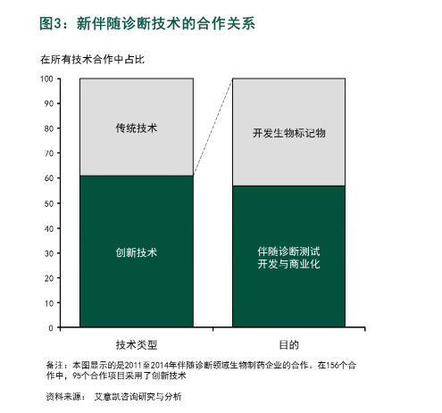 创新诊断技术合作涉足伴随诊断领域 药企正努力将创新诊断技术运用于关键性临床试验,基于这些技术的伴随诊断测试也很可能随之被商业化。 2011年至2014年的合作案例都验证了这一转变。我们的分析指出有95个合作涉及创新诊断技术。不过令人惊讶的是,半数以上的创新技术合作与发现新的生物标记物无关,而着重于伴随诊断测试的开发和商业化(见图3和表2)。