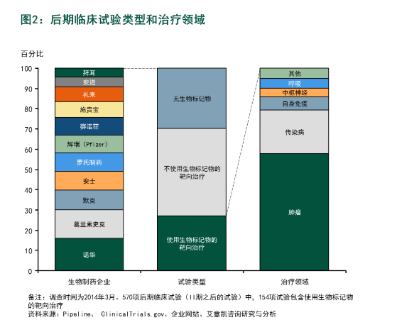 不仅如此,大多数生物制药企业都有一套成熟计划推进个性化治疗。 不过由于这些企业普遍缺少诊断试剂开发和商业化的专家,他们通常会选择与体外诊断公司合作。毫无意外,在和已上市药品相关的合作中,大部分都有国际性肿瘤诊断企业的身影,如雅培分子诊断部门(Abbott Molecular)、丹麦癌症诊断公司丹科/安捷伦(Dako/Agilent)、德国凯杰(Qiagen)和罗氏诊断(Roche)。他们提供聚合酶链式反应(PCR)、免疫组织化学(IHC)以及荧光原位杂交技术(FISH)等体外诊断测试。 对于药物-伴随诊断测试的合作研发,药企的主要目标是降低研发和商业风险。因此,他们青睐的合作伙伴有如下几类: ·诊断企业,有伴随诊断研发经验,有能力按时完成项目,协调开发过程,顺利处理法规相关的事务 · 有成熟技术并已被广泛应用,从而降低法规和商业风险 ·资本雄厚的大型企业,有能力提供全球商业化所需的资金,财务状况稳定 在过去,这种模式尚可满足生物制药企业需求。然而随着个体化治疗技术的飞速发展,对伴随诊断测试及技术平台的需求也必将随之改变。 各大趋势催生创新伴随诊断技术 肿瘤领域内外的许多因素正在重塑个体化医疗的合作格局: ·个体化医疗进入更多肿瘤外的疾病领域 我们最近对行业领先药企的后期临床试验评估显示,在所有治疗领域中,超过27%的试验入组病人使用了生物标记物,并/或将疗效和安全性作为试验终点。值得注意的是,除了肿瘤,传染病、自身免疫、中枢神经系统等其他疾病领域也在临床研发中计划更多使用生物标记物(见图2)。 随着个体化用药逐步扩大至非肿瘤领域,市场需要新的诊断技术来分析不同的样本以及非基因序列的生物标记物。
