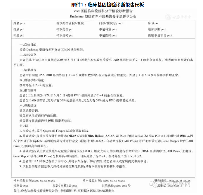 ![]() 临床基因检验已覆盖了肿瘤、遗传病、血液病、感染性疾病、神经精神性疾病、器官移植、出生缺陷、个体化药物治疗等多个领域[1,2,3,4,5,6,7,8],临床基因检验诊断报告对机体易感性评估、疾病诊断、预后、治疗监测、遗传咨询、健康管理以及家庭生育计划制定等均具有重要的参考价值。因此,临床基因检验诊断报告应该明确、简洁、准确可靠,并具有充分的解释、可信性和权威性。中国医师协会检验医师分会分子诊断专家委员会组织相关专家对临床基因检验诊断报告模式进行了研讨并达成以下共识。 一、基本要素 1.题目与格式: 临床基因检验诊断报告应具有醒目的题目,明确标示出检验的靶标。 2.患者信息: 报告中明确包含患者姓名、性别、出生日期,必要时注明种族、籍贯或地域来源。当家族成员多人同时送检时,应有足够信息区分家庭成员身份,需要时包含家族或谱系信息等。对于家系的说明,表格或谱系所提供的信息更适合连锁分析。 3.临床信息: 临床医师应在申请检验时提供简要的临床信息,应至少包含疾病的诊断或初步诊断、申请检验目的(指需要明确疾病发病状态或携带者状态等)、家族史或既往史。实验室人员往往需要结合临床信息对检验结果进行综合分析,必要时根据检验结果提出其他的相关建议。如果未提供任何临床信息,实验室人员应主动向临床咨询[9]。 4.样本信息: 每份样本应当有唯一标识,注明样本类型、样本采集时间、样本接受时间、报告时间、需要时注明样本状态(如:已分离的DNA或已裂解白细胞等)。胎儿标本(如羊膜穿刺标本、绒毛膜标本等)应与其母亲标本清晰分开,且不可以使用母亲姓名。 5.医师和实验室信息: 包括申请医师的姓名、实验室名称、实验室地址和联系电话。 6.页码: 报告单中每页均应包含页码,页码采用"当前页码/总页码"的格式注明,即使报告单仅有1页,也应当采用此种方式进行标注。报告为多页时,每页均应注明患者基本信息和样本唯一标识(如ID号)[10]。 二、特定要素 1.注明方法学: 报告中应简单注明所采用的方法学[11],尤其是针对某一检验项目具有多种检验方法时。这对分子检验项目非常重要,因为该患者的家属可能在其他实验室进行了检验,或者该患者(尤其是阴性结果)会在今后进行随访检验。 2.注明检验程度的详细信息: 应明确说明所检验的基因座位或突变位点,这一点在报告阴性结果时至关重要。 3.分子遗传检验项目: 应提供基因参考序列。 4.质量控制信息[12]: 需要时应注明,如涉及肿瘤病理标本应说明肿瘤细胞的百分比等信息。 三、结果报告 1.结果报告方式: 临床基因检验诊断报告应采用简洁清晰的报告方式,包含所采用的分析过程及对实验结果的解释,使得检验结果和所包含的信息能有效地传达给临床医师。应准确客观地描述所检验的结果,避免引起歧义[13,14]。定性试验不应简单地报告为"阴性"、"阳性"或"不确定",结果报告中应至少包括检验目标,如:"HCV RNA检验"、"沙眼衣原体DNA检验",阴性结果应描述为"未检出"、"低于检验下限"或"未检验到突变"。定量试验的检验结果需提供具体测定数值及参考范围。基因型或基因变异的检验结果需明确描述所检验的基因位点或变异位点。必要时,在报告解释中进行详细说明。 2.术语规范描述: 检验结果中的术语应使用国际权威组织或数据库发布的最新标准命名,并在报告解释中注明出处。当某个非正式命名被广泛使用时,也可包含此名称,可以用括号将非正式命名放于标准命名的后面;或者将通用的非正式命名放在结果部分,而将标准命名放在报告解释的方法学部分;或者在报告解释中单独加以说明。对于分子遗传检验,参考序列和命名应当使用当前的人类基因组变异协会(HGVS)的标准命名;对于细胞遗传和微阵列芯片,应当采用最新版本的人类细胞遗传学国际命名体制(ISCN)的标准命名[2]。 3.注明所采用的数据库: 需要注意不同的数据库版本中,基因碱基号码或者密码子的号码可能不同,此时应根据最新的数据库进行标注[15,16,17,18]。 4.结果报告内容: 不应使用含义模糊的词汇,不可使用"+"或"-"符号,因为阴性结果容易被非专业人士误解为"已排除"。如:对于初诊白血病患者微小残留监测分子标志物筛查,如未检出融合基因和抗原受体基因单克隆重排,应描述为"未筛查到合适的微小残留监测分子标志物"。如筛查到合适的微小残留监测指标,应描述为"筛查到xx融合基因和xx抗原受体基因重排(如TCR基因Vδ2-Dδ3重排),可作为微小残留监测的分子标志物",基因重排分子标志物应进一步注明个体特异性的结合部序列,以供患者转至其他医疗机构治疗和监测时参考。对于诱导缓解治疗后及持续治疗中的白血病患者进行微小残留监测时,监测结果以百分比(白血病细胞占单个核细胞的比例)形式报告监测结果。 5.多项检验结果报告: 多种可能的病理性变异被检出时,应对该变异进行说明。多项检验的结果应该分开报告。 6.药物治疗相关的报告: 应结合患者的临床资料以及比较全面的药物相关基因信息等给予用药的建议。 7.检验结果与其他结果不符时的报告要求: 检验结果与其他实验结果或临床资料不符时,应进行调查并将资料备案,必要时进行验证。 8.结果录入要求: 为避免错误,不支持手写报告,应使用计算机录入结果。 9.报告中实验室自建方法信息: 采用