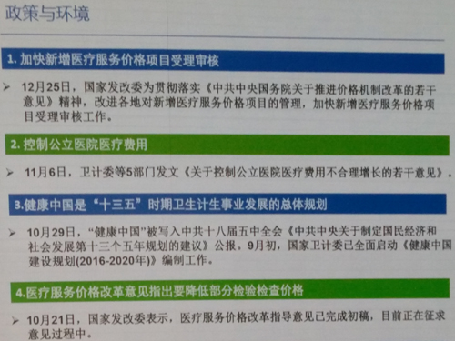 ![]() 朱耀毅,复星医药副总裁兼医学诊断事业部董事长 体外诊断(IVD)被业内形容为“正在崛起的朝阳产业”。2016年6月29日,第三届中国IVD产业投资与并购CEO论坛在美丽富饶的钱塘江畔、充满活力的下沙新城召开。本届大会由包括来自产业界、投资界和其他专业领域的超过300人的嘉宾参与,是三届以来规模最大的一次。来自复星医药副总裁兼医学诊断事业部董事长朱耀毅以《中国体外诊断行业年度报告(2015年)》为契机,为与会者做了《中国体外诊断行业进展及前景展望》。 据日前由全国卫生产业企业管理协会医学检验产业分会、中国医疗器械行业协会体外诊断分会联合发布的《中国体外诊断行业年度报告(2015年)》分析:目前,国际IVD巨头已进入国内市场,国内企业也已形成相对稳定的发展格局。结合国家相关产业政策分析,预计未来一年国内IVD行业仍将平稳增长。 ![]() 一、政策与环境 2015年是医药卫生及相关政策发布较多的一年。这些政策与环境的变化推动了体外诊断行业的发展,促使行业企业管理更加规范和自律,提升企业创新能力,对整个行业有积极与深远的影响。下面把这一年主要政策按时间顺序由近到远梳理如下: ![]() 1、加快新增医疗服务价格项目受理审核 12月25日,国家发改委为贯彻落实《中共中央国务院关于推进价格机制改革的若干意见》精神,改进各地对新增医疗服务价格项目的管理,鼓励研发创新,促进医疗新技术及时进入临床使用,营造大众创业、万众创新良好环境,加快新增医疗服务价格项目受理审核工作。 各地受理新增医疗服务价格项目,不受《全国医疗服务价格项目规范(2012年版)》限制。对涉及试剂、耗材和设备等医用产品的项目,只要相关产品获得有关部门批准生产、具备市场准入条件,均应纳入新增医疗服务价格项目受理范围。 对有关单位报送的新增医疗服务价格项目,各地要及时受理,高效办理。要进一步简化工作程序,按照鼓励创新和使用适宜技术相结合的原则加快审核,及时公布审核结果。 对审核通过的新增医疗服务价格项目,各地要明文规定在本行政区域内执行,并明确项目编码、项目名称、项目内涵、价格水平或价格管理形式等。 各地不得以任何名义和方式,拒绝或推诿新增医疗服务价格项目的受理审核工作。 2、控制公立医院医疗费用 11月6日,卫计委等5部门发文《关于控制公立医院医疗费用不合理增长的若干意见》。文中指出随着社会经济发展,医疗卫生事业进入快速发展阶段,医疗费用上涨较快。同时,医药费用结构和增长情况也存在不合理因素要进行控制,包括城市公立医院的费用在医药费用总量中占比较大,药品、大型医用设备检查治疗和医用耗材收入占比较高等。 今后,公立医院的医疗费用控制情况将与公立医院等级评审准入、财政拨款预算安排、院长年度绩效考核、医务人员的评优绩效工资分配等方面的绩效考核评价挂钩。 3、健康中国是“十三五”时期卫生计生事业发展的总体规划 10月29日,“健康中国”被写入中共十八届五中全会《中共中央关于制定国民经济和社会发展第十三个五年规划的建议》公报。今年9月初,国家卫计委已全面启动《健康中国建设规划(2016-2020年)》编制工作。 推进健康中国建设,深化医药卫生体制改革,理顺药品价格,实行医疗、医保、医药联动,建立覆盖城乡的基本医疗卫生制度和现代医院管理制度,实施食品安全战略。促进人口均衡发展,完善人口发展战略,全面实施一对夫妇可生育两个孩子政策,积极开展应对人口老龄化行动。预计全面放开二胎政策带来300-500万年新增人口,短期人口增量可能会在未来5年释放,共计1500-2500万人口。 4、医疗服务价格改革意见指出要降低部分检验检查价格 10月21日,国家发改委表示,医疗服务价格改革指导意见已完成初稿,目前正在征求意见过程中。 近年来,国家发改委会同有关部门加大了医疗服务价格改革的力度。统一规范医疗服务价格项目,开展按病种、按服务单元等收费方式改革试点,特别是指导地方配合公立医院改革,通过取消药品加成及降低药占比、降低部分检验检查价格、调整医疗服务价格、落实政府办医责任等综合措施和联动政策,也促进了医疗机构新型补偿机制的建立。部分医疗服务价格可由医疗机构自主定价。 医疗服务价格改革强化价格、医保、医疗等相关政策衔接,一是与充分发挥医保控费作用相结合;二是与建立科学补偿机制相结合;三是与减轻患者负担相结合。确保医疗机构良性运行、医保基金可承受、群众负担不增加。 5、健全分级诊疗体系、加强全科医生培养,推动医师自由执业 9月11日,国务院公布《关于推进分级诊疗制度建设的指导意见》。意见讲到目前正在努力通过各种各样的政策、措施和工作,增加建立分级诊疗制度的落实。实施基层首诊、双向转诊、急慢分治、上下联动的分级诊疗模式。 到2017年,分级诊疗政策体系逐步完善,医疗卫生机构分工协作基本形成,基本建立符合国情的分级诊疗制度。到2020年,分级诊疗服务能力全面提升,保障机制逐步健全,形成布局合理、规模适当、层级优化、职责明晰、功能完善、富有效率的医疗服务体系基本构建。 6、互联网+医疗会对行业有长远影响 6月24日,国务院常务会议通过《“互联网+”行动指导意见》部署,推进“互联网+”行动。在国家大力