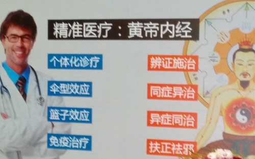 中医和西医之间在什么点上能找到均衡?尹烨将“精准医学”的核心与“黄帝内经”的精髓做了对比。在他看来,“精准医学”中的个体化诊疗类似“黄帝内经”中的辩证施治;伞型效应类比同症异治;篮子效应类比异症同治;免疫治疗类比扶正祛邪。