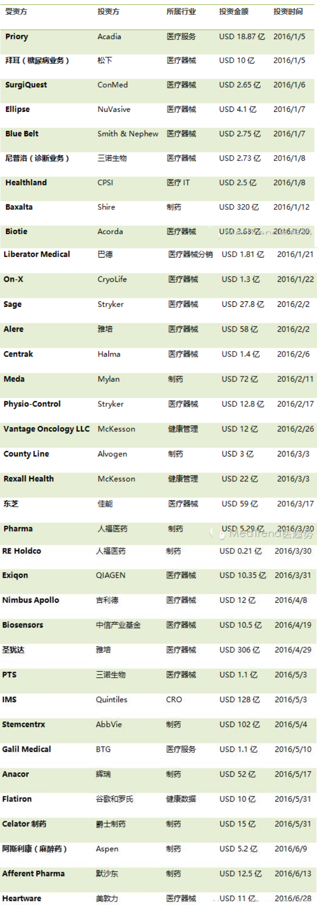 ![]() NO.1 Shire以320亿美元收购Baxalta ![]() 行业:制药 交易状态:圆满完成 经过长达六个月的谈判之后,伦敦制药商Shire最终宣布,计划以320亿美元现金和股份交易的方式,收购Baxalta,此次交易将让Shire在治疗罕见病方面占据更大优势。 但今年才刚刚过去了一半。有一笔重大交易可能会取而代之,成为今年规模最大的并购交易——目前德国制药业巨头拜耳(Bayer)与其意向收购目标孟山都,正在反复进行谈判。拜耳在五月份对后者提出的收购要约是令人瞠目的620亿美元。但孟山都拒绝了这一要约,称这一价格“不完善,且经济条件不足。”目前有关该笔交易的谈判仍在进行当中。 NO.2 雅培制药(Abbott Laboratories)306亿美元收购圣犹达医疗(St Jude Medical) ![]() 行业:医疗器械与设备 交易状态:预计交易将于今年第四季度完成 雅培制药宣布,以250亿美元现金和股份交易的形式,收购圣犹达医疗,并承担圣犹达约57亿美元的净债务,或进行债务再融资。 这是今年医疗保健行业最轰动的并购交易之一,合并后的公司将在竞争日益激烈的市场,拥有更强大的医疗器械业务。规模的扩大,也将使雅培制药拥有更多的市场定价权。 NO.3 IMS Health Holdings与昆泰跨国控股公司(Quintiles Transnational Holdings)合并,规模128亿美元 ![]() 行业:生物科技 交易状态:交易预计在2016年下半年完成 CRO巨头昆泰跨国控股公司,同意与医疗保健信息公司IMS Health合并为昆泰IMS(Quintiles IMS)。 IMS Health董事长兼CEO博安睿在声明中表示:“此次合并解决了生物科技公司最迫切的需求:改变创新药物的临床开发,证明这些药物在真实世界中的价值,加快取得商业成功。” NO.4 AbbVie102亿美元收购干细胞研究肿瘤药企Stemcentrx ![]() 行业:制药 交易状态:并购意向宣布 硅谷商业杂志(the Silicon Valley Business Journal)称,从已有的最高数字来看,这可能是风投史上的第二大收购案。AbbVie董事长兼CEO Richard A. Gonzalez在一份声明中说道,“收购Stemcentrx及它的Rova-t,为我们在实体肿瘤治疗上提供了一个独特的平台,将助力确定我们在血液肿瘤中的领导地位。同时,将使我们加快提供创新的治疗方法,从而对患者的生活产生积极的影响。 NO.5 荷兰非专利药生产商Mylan以72亿美元收购瑞典Meda ![]() 行业:制药 交易状态:并购意向宣布,持有约30%流通股的Meda两大股东已接受了这一报价。 Mylan表示,收购Meda将有利于公司构建专业通用和非处方产品盈利组合。该项收购也将有助于Mylan进入如中国、俄罗斯和中东在内的新兴市场。Mylan预计这笔交易将在2017年贡献每股40美分的收益。 NO.6 佳能宣布59亿美元收购东芝医疗设备部门 ![]() 行业:医疗器械与设备 交易状态:日本公正交易委员会6月30日宣布,允许佳能收购东芝的医疗器械子公司“东芝医疗系统” 处于重组期的东芝3月宣布将东芝医疗以约6655亿日元(约合431亿元人民币)的价格出售给佳能。东芝将把这笔资金用于增强自身资本,以帮助恢复其业绩。东芝2015年因财务造假问题等盈利能力下降,加上大规模裁员费用等使得财务状况进一步恶化。为恢复自身资本,公司进行了优质子公司东芝医疗的出售招标。日本公正交易委员会30日宣布,允许佳能收购东芝的医疗器械子公司“东芝医疗系统”;然而认为收购程序有可能违反《反垄断法》的规定,要求佳能加以注意。 NO.7 雅培宣布以58亿美元收购诊断服务商Alere ![]() 行业:医疗器械与设备 交易状态:这起交易仍在接受联邦政府调查 今年二月,IVD大鳄雅培(Abbott)宣布以58亿美金收购POCT霸主美艾利尔(Alere);如果交易顺利完成,不仅使雅培一举登上仅次于罗氏的全球IVD行业第二把交椅,POCT的市场格局更是就此改变。然而到了4月,由于Alere推迟公布2015 Form 10‑K以及政府的调查事宜,雅培称愿意支付3000-5000万美元的违约金以停止对美艾利尔的收购;Alere董事会立即拒绝了雅培的提议。目前这起交易仍在接受联邦政府调查。 NO.8 辉瑞宣布以52亿美元收购生物医药制造商Anacor ![]() 行业:制药 交易状态:有望于今年第三季度达成 总部位于加州帕洛阿尔托的Anacor公司和总部位于纽约的辉瑞公司在治疗炎症和免疫产品组合方面具有较强的契合度。目前Anacor公司并没有正在市场销售的产品,但是其旗舰产品crisaborole正接受美国食品和药物管理局对其在治疗湿疹方面效果的评估和审核。辉瑞表示,这笔交易有望于今年第三季度达成,且将不会影响公司今年的盈利预期。 NO.9 Stryker27.8亿美元收购医疗器械制造商Sage ![]() 行业:医疗器械与设备 交易状态:该交易将在2016年第二季度完成 Stryker表示,该交易金额包含了金额高达5亿美元的税收收益,将在未来12年的现金流中逐年体现。据悉,该交易将在2016年第二季度完成。Sage是一家美国开发一次性医疗和个人护理产品的公司,提供口腔医疗护理,皮肤再生及保护,病人清洁护理、安装及定位足部医疗器械服务等。Stryker 首席执行官Kevin A.Lobo 表示两家公司在产品生产上完全互补,尤其是在急需的感染科领域。Lobo还表示,Sage的引入将提供连续的未被开发的收入流。由此看出CEO对此项交易的信心。 NO.10 麦克森22亿收购加拿大私人健康公司Rexall Health ![]() 行业:健康管理 交易状态:并购交割 通过此次交易,麦克森将获得约470家零售药店,强化公司在加拿大安大略省和西加拿大地区的业务能力。麦克森最近收购动作频繁,2月26日,曾以12亿美元收购本国两家癌症医护机