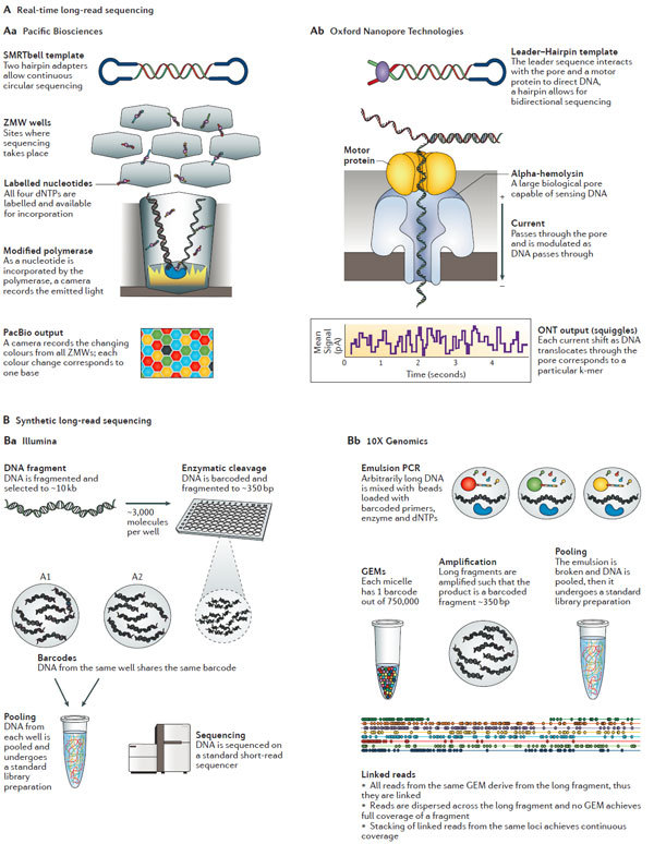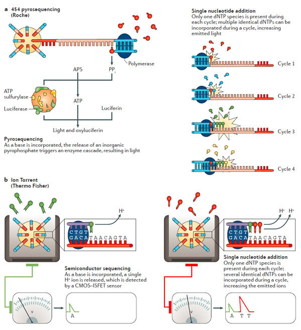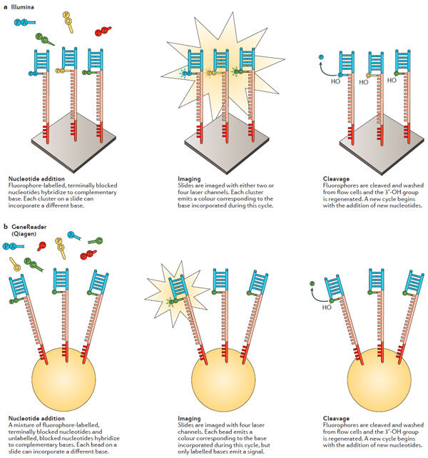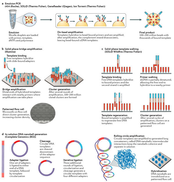 随 着人类基因组计划(human genome project )在2003年顺利完成,基因组测序技术取得了长足的进步,这直接导至了每兆基因组成本的大幅下降以及检测的基因组数量越来越多。人们对基因组的复杂性深 感震惊,这也引导着测序技术的进一步发展。最近的一些突破性技术使得测序技术在更短的时间内可以获得更多的数据量。与之对应的是,还有一些技术的进步使得 单条序列的测序读长变得更长——这对解析结构性的复合区段是极其必要的。这些进展给科研人员以及医疗诊断人员提供了一个绝佳的平台使得人们对基因组变异导 致的表型变化以及疾病发生有了进一步的了解。 近日,美国冷泉港实验室联合加州大学戴维斯分校的研究人员在国际著名评论型综述杂志Nature Reviews Genetics(影响因子41)上发表了一篇评论型综述。该综述对高通量测序的技术原理以及各平台的优势比较和实践应用进行了深入浅出的分析。 介绍 自 从DNA的双螺旋结构被人们解析开始1,人们在探究健康与疾病的基因组的复杂性与差异性上做出了巨大的努力。为了支持人类基因组计划的顺利进行2,人们在 仪器和试剂上做出了巨大的改进。该计划的完成使得人们强烈的意识到人们需要更多更好的技术与数据分析能力来回答随之而来的一系列生物学问题。然而,通量的 限制以及居高不下的测序成本成为了人们进一步了解基因组的一道坎。2000年之后推出的高通量测序平台很好地解决了这个问题,人类基因组测序的成本直接因 此下降50000倍,并且由此产生了一个新的名词:下一代测序(next-generation sequencing,NGS)3。在过去的十年中,NGS技术不停的在进步——测序的数据量增加了100-1000倍4。这些技术上的进展使得人们甚至 可以在一条read上读出整条基因组序列。根据Veritas Genomics的数据5,人类基因组测序的成本也已经下降到1000美元/人。不仅如此,该技术已经广泛在临床诊断上得到应用3,6。 但 是,尽管NGS技术非常重要,却并非完美。与NGS技术一道出现的是该技术带来的一系列问题。NGS可以提供海量的数据量,但是其质量却有待提高(有报 道,NGS在序列拼接过程中,错误率在0.1-15%范围内),并且NGS的序列读长普遍较低(每条read的长度在35-700bp之内7,这比普通的 Sanger测序要短),这意味着需要更严格复杂的序列拼接。尽管长读长测序可以克服NGS的这一大弱点,但相对而言,成本较高并且通量较低,这也限制了 该技术的进一步应用。最后,NGS同时还和其他的技术之间存在着竞争的关系。 短读长(read)的NGS测序 测序模版克隆法生成综述 短 读长测序方法包含两种:边连接边测序(sequencing by ligation, SBL)以及边合成边测序(sequencing by synthesis, SBS)。在SBL方法中,带有荧光基团的探针与DNA片段杂交并且与临近的寡核糖核酸连接从而得以成像。人们通过荧光基团的发射波长来判断碱基或者其互 补碱基的序列。SBS方法通常使用聚合酶,而且,诸如荧光基团在链的延伸过程中被插入其中。绝大多数的SBL和SBS方法,DNA都是在一个固体的表面上 被克隆。一个特定区域内成千上万个拷贝的DNA分子可以增加信号和背景信号的区分度。大量的平行同样对上百万的reads的读取大有帮助,每个平行只有唯 一的DNA模板。一个测序平台可以同时从上百万的类似反应中读取数据,因此可以同时对上百万的DNA分子进行测序。 产生模板的克隆有几个方 法:基于磁珠(bead-based),固相介质(solid-state)以及DNA微球技术(DNA nanoball)(图1)。DNA模板产生的第一步就是样本DNA的片段化,接着是连接到一个为了克隆和测序而设计的接头上。在磁珠法的准备过程中,一 个接头和寡核糖核酸片段互补并且固定在珠子上(图1a)。DNA模板通过使用油包水PCR(emulsion PCR,emPCR)8得以扩增。单个珠子上被克隆得到的DNA片段可以达到上百万个9。这些珠子可以被分为glass surface10或者PicoTiterPlate(罗氏诊断)11。固相介质扩增12避免了油包水PCR,取而代之的是在固相介质上直接进行 PCR13(图1b,c)。该方法中,正向和反向引物结合在芯片的表面,这些引物给单链DNA(single-stranded DNA,ssDNA)提供了末端的互补序列供其结合。最近,几个NGS的平台都是用了模块化的flow cells。 BGI使用的 Complete Genomics technology测序技术是唯一一个在溶液中完成模板富集的技术。在这种情况下,DNA被多次连接,成环以及剪切从而为了产生一个包含4个不同接头的 环状的模板。通过旋转环状扩增(rolling circle amplification,RCA),可以最多产生超过200亿的DNA微球(图1d)。微球混合物随后被分配到芯片表面上,使得每个微球可以占据芯片 的一个位点14。 图1:模板扩增策略。 边连接边测序(SOLiD和Complete Genomics) 从 根本上来说,SBL法包含了杂交和对标记的探针的连接15。探针包含了一到两个特定碱基序列和一系列通用序列,这可以使得探针与模板之间进行互补配对。锚 定的片段则包含一段已知的和接头互补的序列用于提供连接位点。连接之后,模板被系统进行测序反应16。在锚和探针复合物或者荧光基团被完全移除之后,也或 者连接位点重新生成之后,新的循环又重新开始了。 SOLiD平台使用的是双碱基编码的探针,每个荧光基团信号代表了一个二核糖核酸17。因 此,原始输出的数据并非直接和已知的核糖核酸相连。因为有16种可能的二核糖核酸组合并不能单独结合荧光基团。每四种组合使用一种荧光信号,共有四种荧光 信号。所以,每种连接信号代
