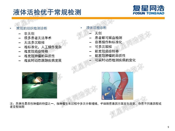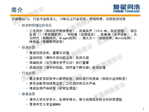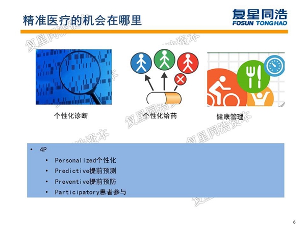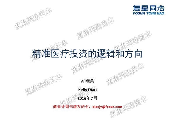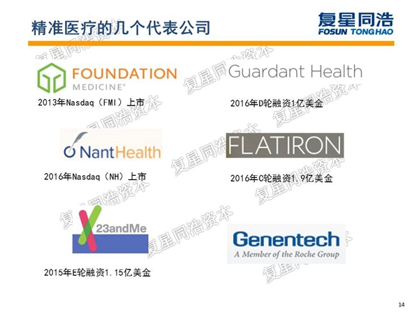 从疾病的领域来说不仅是肿瘤领域需要精准治疗疑难杂症,在其他的领域像呼吸系统、抗感染、心脑血管这些领域都有问题,这张PPT中的图表是统计2014年到2015年间美国市场大概投入了多少钱研究解决各种不同疾病。 8精准医疗的代表公司各有千秋 ![]() 刚才讨论了很多精准医疗方向性的东西,现在来看代表性的公司。 第一家公司是FOUNDATION Medicine,已经在纳斯达克上市,后来被罗氏诊断收购。这家公司把目前为止发现的几乎所有的Biomarker做了检测,理论上用它来检测就可以发现到底哪些肿瘤基因发生了突变。 第二家公司是Guardant Health。这家公司成立四年左右,主要做液体活检ctDNA检测,现在非常受到资本追捧和青睐,2016年D轮融资1亿美金,已经建了世界上最大的液体活检数据库,大约有2万例的病例。 第三家公司是Nant Health。这家公司的创始人是医生出身,所以对临床治疗方案比较熟悉,它把现在所有的临床方案都收集进入一个系统,这样医生在看病的时候就会有章可循。对保险公司也是一种重要的控费手段,利用这个系统保险公司就可以规定医生必须按照标准化的规范开药,如果医生乱开药或者多开药就会被发现。 第四家公司是FLATIRON,也是肿瘤大数据,但它跟Nant Health是不一样的路线,创始人是IT出身的两位年轻人,致力于建立云端医疗数据库,通过数据挖掘战胜癌症。 第五家公司是23andMe,这是一家典型的互联网+医疗公司,它的创始人是谷歌联合创始人谢尔盖·布林的妻子Anne Wojcicki女士,这家公司想做成医疗领域的谷歌,已经搜集了很多美国个人基因组的信息。这家公司经过几年的积累,已经有了最大的帕金森患者的基因数据库,后来将这些数据与基因泰克公司进行商业化合作。帕金森病现在还没法治疗,主要原因是不知道到底因为什么患病,在分子水平和基因水平上帕金森患者到底发生了哪些变异,23andMe这个数据非常有价值。 9精准医疗的投资逻辑就是找准target 总结来讲,精准医疗包括个性化的诊断、个性化的治疗和个性化的健康管理,这些的前提都是要知道基因水平的差异,这些差异就是精准医疗发挥价值的target。 其实对整个行业来讲,都需要精准化。医生需要从经验、直觉医疗到精准诊疗;患者/用户需要个性化的解决方案;药企也需要找出新的biomarker并研发出针对靶点的药物;保险公司需要精准化管理用户,同等条件下,经常锻炼身体健康饮食的人保费要比不锻炼的人低;医院的分级诊疗目标也是精准化。 对我们投资来讲,也是要精准化,对创新的检测技术、新的biomarker应用、健康和疾病管理、大数据都要进行相应布局和投资。 精彩问答 Q:消费级的基因检测,您是否看好,您觉得这方面成功的关键要素是什么? 乔继英:用于临床诊断的基因检测可以称为医疗级,医疗级和消费级的基因检测都有机会,比如23andMe做的就是消费级的基因检测。 23andMe解决的问题是让每个人了解自己的基因信息,比如说检测自己会对什么样的物质过敏,你的祖先是谁。 对消费级基因检测发展的关键要素有两个: 一是要有清晰的获客方式。因为消费级的用户比较分散,要用更低的成本获客。消费场景很重要; 二是检测技术的成本要低。大规模应用的消费级基因检测必须低成本,比如23andMe选择了芯片技术,收费99美金,成本比较低。 Q:2015年12月,百度CEO李彦宏个人捐赠3000万元,支持百度与北京协和医学院针对食管癌基因组研究的合作,请乔总能就这个现实中的案例向大家解释一下,他们要做什么,如何做? 乔继英:首先这是一个个人行为,个人行为更多是有公益的性质在里面的。第二个是这笔资金用于支持顶尖的医学院协和的食管癌基因组课题,如果有很多、很好的病例来做基因组研究,可以发现中国的食管癌患者在基因方面有什么样的特性,有什么样的变异,从而制定个性化的治疗。 从个人来讲,特别希望成功人士多花一些钱来支持基础性的研究。 Q:您认为精准医疗领域有没有泡沫? 乔继英:现在精准医疗领域有泡沫,主要体现在两个方面: 一是因为国家层面从美国、中国都支持精准医疗,国内现在几乎能扯上边的都说自己做精准医疗,很多人跟风炒作,现在一定是有泡沫的。但其实精准医疗是有门槛的。 二是现在精准医疗的创业公司估值过高。前期估值过高对创业公司并不是好事,会影响后期发展和融资,业务压力也会比较大。 Q:有专家曾说过,精准医疗最终可能会改变疾病分类体系,在未来5~10年,肿瘤的分类可能不是现在的分类方式?您觉得有没有可能? 乔继英:这个问题很有水平。分类方法有没有可能改变?有可能,会在现在基础上加上更多分子和基因水平的信息,现在基本上是按原发癌的部位来分的,像胃癌、肺癌、乳腺癌,以后会加上基因突变来分析,比如说HER2,这个基因突变在乳腺癌里有,在胃癌里也有。所以会有更多用分子水平变异进行的分类,未来医疗中是有可能采用这个分类体系的。 Q:乔总好,有些公司在做基因检测产品应用服务,也就是说,只是包装精准医疗产品,核心技术是别人的,这样的公司是否看好?请问现在国内做基因测序和数据运算的公司发展情况如何? 乔继英:基因检测现在大家用的仪器都差不多,在仪器方面很难有其他创新,除非有第三代和新的检测技术。但从应用来说,它的价值在于能不能发现新的Biomarker,是不是能够对疾病有更加深入的了解,能不能发现新的Biomarker用