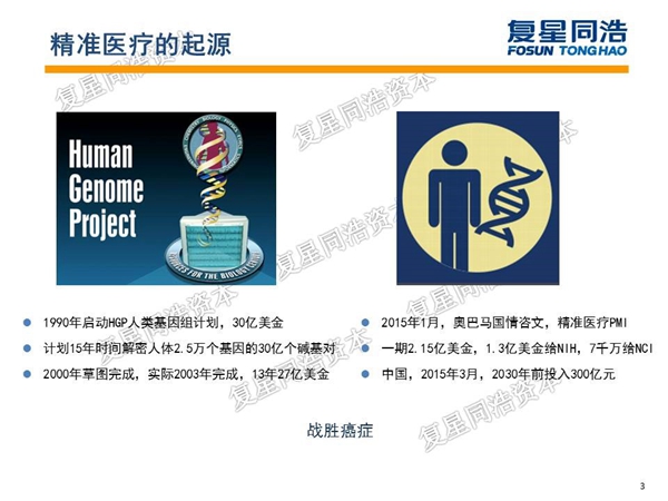 精准医疗的起源来自哪里?是从战胜癌症起源的。最早是从人类基因组计划(human genome project, HGP)开始的。该计划由美国、英国、法国、德国、日本和中国科学家共同参与,预计用30亿美元、15年时间把人体内约2.5万个基因的密码全部解开,同时绘制出人类基因的图谱。 到2003年为止,这个项目历时13年耗费27亿美金,第一次做出了人类基因的图谱,30亿个碱基对的2.5万个基因。 为什么要做HGP呢?主要是因为想要找到癌症的病因和解决方案。但HGP完成后,科学家们发现只知道这些基因序列还是不知道怎么治疗癌症。随后有了现在的精准医疗计划。 2癌症的个性化治疗和个人健康疾病档案库成为美国精准医疗计划的两个目标