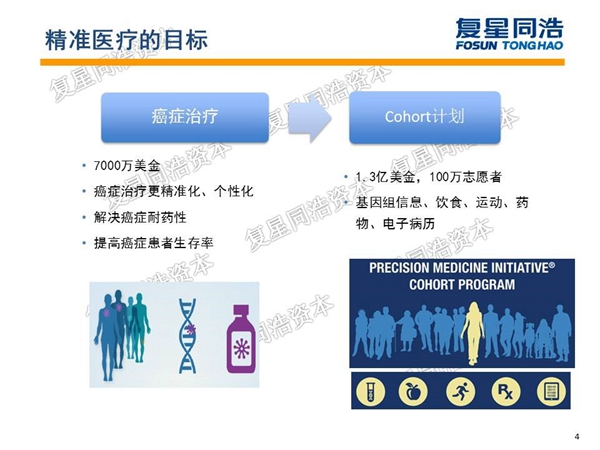 2015年1月,美国就率先提出了精准医疗计划。“精准医疗”或者“个性化治疗”的概念在此前已有,但在国家层面是第一次推动。 美国的精准医疗计划有两个目标,第一个目标是癌症的个性化治疗,7000万美元预算,让癌症的治疗更精准化、个性化,也解决癌症的耐药性,提高癌症患者的生存率。 现在业内流传一句话,在癌症治疗中有三分之一的患者吃药有用,有三分之一没用,还有三分之一可能吃错药。比如说白血病有20多种,肺癌16种,不同的癌症其实从分子水平来说原因不一样,所以不同个体的用药也不一样。 第二个目标是志愿者计划(Cohort计划),这一部分准备花费1.3亿美金来对100万的志愿者进行长期跟踪,建立个人健康和疾病数据库。这个数据库包括个人的基因组信息,包括饮食、运动、吃的药和电子病例。 这个计划听起来很大、费用很高,但事实上每个患者或用户大约也就花130美金。 到底这个计划能做成什么样,我们也在观察。 3技术进步、成本降低、疾病认知加深和个人健康意识提高是精准医疗兴起的四大条件