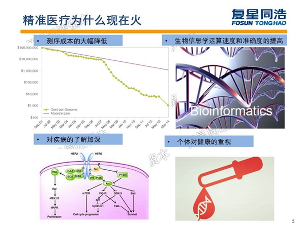 业界很早就形成了共识,要走个性化诊断和个性化治疗这条路。但为什么精准医疗这两年才热起来?因为精准医疗产业的兴起除了生物信息学运算速度和准确度提高之外,还需要几个必要的条件。 首先必须大幅降低基因测序的成本。 在芯片的研发生产过程中有摩尔定律,摩尔定律是由英特尔(Intel)创始人之一戈登·摩尔(Gordon Moore)提出来的。其内容为:当价格不变时,集成电路上可容纳的元器件的数目,约每隔18-24个月便会增加一倍,性能也将提升一倍。换言之,每一美元所能买到的电脑性能,将每隔18-24个月翻一倍以上。这一定律揭示了信息技术进步的速度。 在基因测序里面也有摩尔定律,只有基因测序成本不断降低,才能做到对个体个性化的诊断和测序。基因测序的成本大概是从“亿美金”、“百万美金”降到了“千美金”,成本降低就意味着大规模应用的时代到来了。 第二是人类必须更了解疾病。 随着对生物学信号通路或者疾病基础理论的了解,我们对疾病了解越来越深。这张PPT左下角的图就是“HER2信号通路”示意图。 原癌基因人类表皮生长因子受体2(human epidermal growth factor receptor-2,HER2)基因,即c-erbB-2基因,也被称为HER2。 有报道表明,20-30%的乳腺癌患者存在HER2突变,正是因为发现这个基因的突变,才开发了一个特别针对乳腺癌的肿瘤药物——赫赛汀。这是非常典型的个性化诊断和个性化治疗的案例,这也说明我们必须对疾病的了解逐步加深,才可能出现精准化的诊断和精准化的治疗。 第三是个人健康意识的提高。 随着人均生活水平提高,或者是对健康意识的提高,现在个体对自己的健康越来越重视,这也是现在精准医疗火的很大的促进因素。 4个性化诊断、个性化给药和健康管理是精准医疗的3大关注方向 精准医疗的机会特别多,市场也特别大,这些机会细分起来到底在什么领域?我认为初步可以分为三个领域。第一个领域是个性化的诊断,第二个领域是个性化的给药,第三个领域是健康管理。 刚才HER2的例子就说明:不同的病人即使同样患乳腺癌,因为基因水平不一样,患病原因有差异。先诊断后治疗,治疗的前提是先诊断准确,只有基于个性化的诊断,才能进行个性化的给药。个性化诊断和个性化给药密不可分。 刚才提到的精准医疗志愿者计划,就是属于健康管理的范畴,根据每个人不同基因的特性,根据你的饮食、运动、用药情况为人们做很好的健康管理。 精准医疗也称为个性化的医疗,它被一位尊敬的业内前辈Leory Hood总结为“4P医疗”,即预测(Prediction)、预防(Prevention)、个性化(Personalization)、参与(Participation)。 5液体活检技术为什么是倍受关注的诊断技术 精准医疗或者个性化治疗第一步是先诊断,诊断存在两个主要的方向。